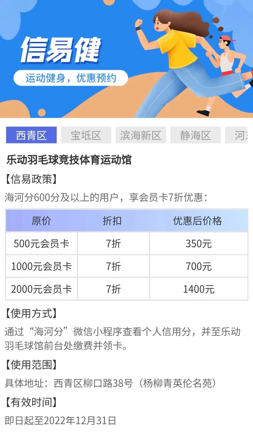 拓展信用应用,增强诚信获得感。依托信用信息归集,居民可在市公共信用中心开发的天津市信用惠民小程序“海河分”中获得自己的个人信用“海河分”,享受信用惠民应用场景的优惠福利。该委积极拓展信用惠民应用场景,协商乐动羽毛球馆推出“信易健”惠民场景,为“海河分”个人信用分达到600分以上的用户提供健身会员卡7折的优惠。整合区内旅游资源,向达到一定分数的“海河分”用户推出“信易游”惠民场景,石家大院、精武门中华武林园、水高庄园及热带植物园等热门景点门票优惠,近期将入驻“海河分”微信小程序。