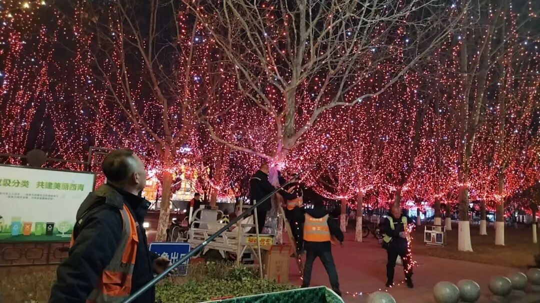 在灯饰亮起来的同时,西青区园林绿化也在悄然焕新。区城管委持续加强杨柳青镇区、主干道路及重点区域的绿化养护,累计清除绿地垃圾约3000吨,修剪乔灌木5万余株,修复防盐防寒设施300延米。“我们密切关注天气变化,提前做好降雪、大风等恶劣天气防范,确保绿地环境整洁靓丽。”现场一位园林工作人员说道。