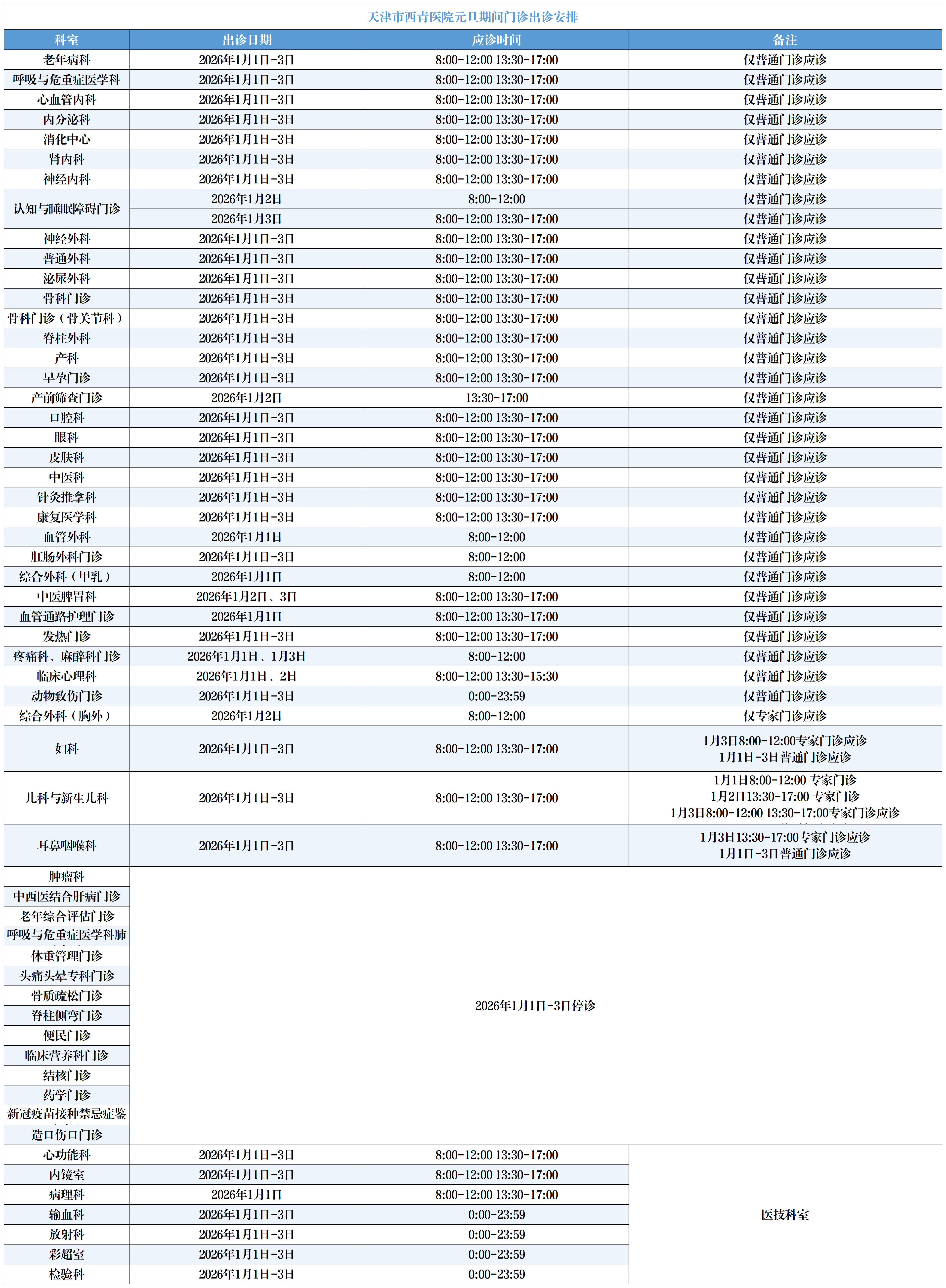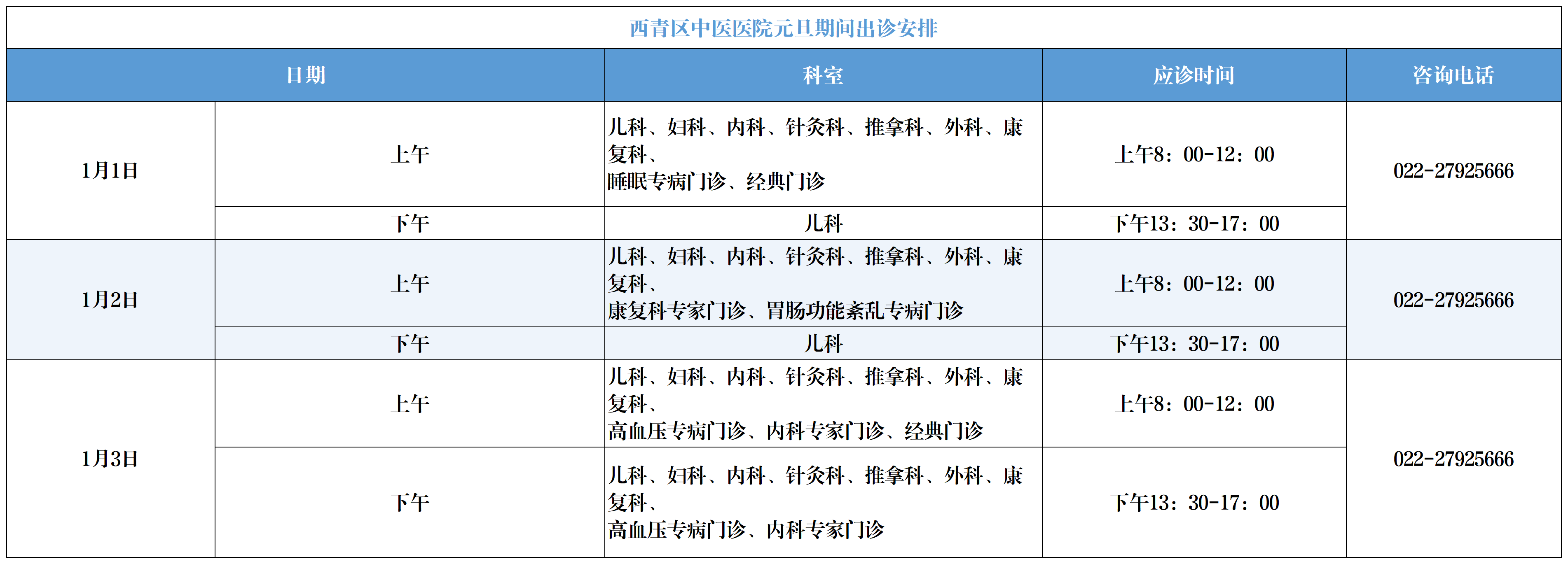 为方便居民在元旦假期期间合理安排就诊,现将西青区各公立医疗机构2026年元旦假期出诊安排汇总如下。请广大居民提前知悉,并结合自身需求选择就医。