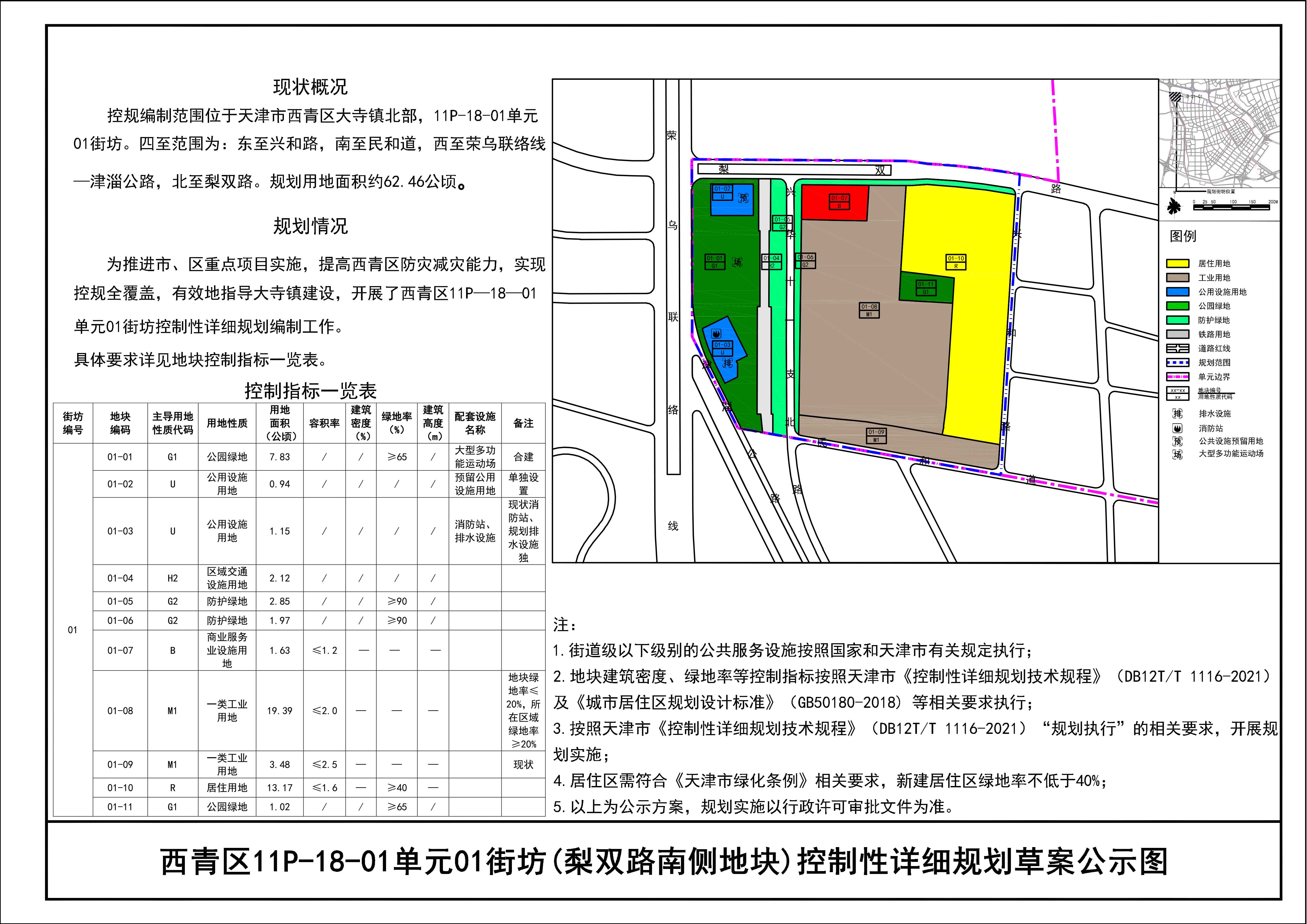 按照《中华人民共和国城乡规划法》《天津市城乡规划条例》等法律的有关要求,现将西青区11P-18-01单元01街坊(梨双路南侧地块)控制性详细规划草案在天津市规划和自然资源局官网、西青区人民政府官网、天津日报、天津市规划和自然资源局西青分局一楼大厅、大寺镇人民政府一楼大厅、梨双路与李港铁路交口等处予以公示,公示期为2025年12月19日至2026年1月19日。公示期内可通过电子邮箱或信件方式反馈意见,逾期视为无意见。