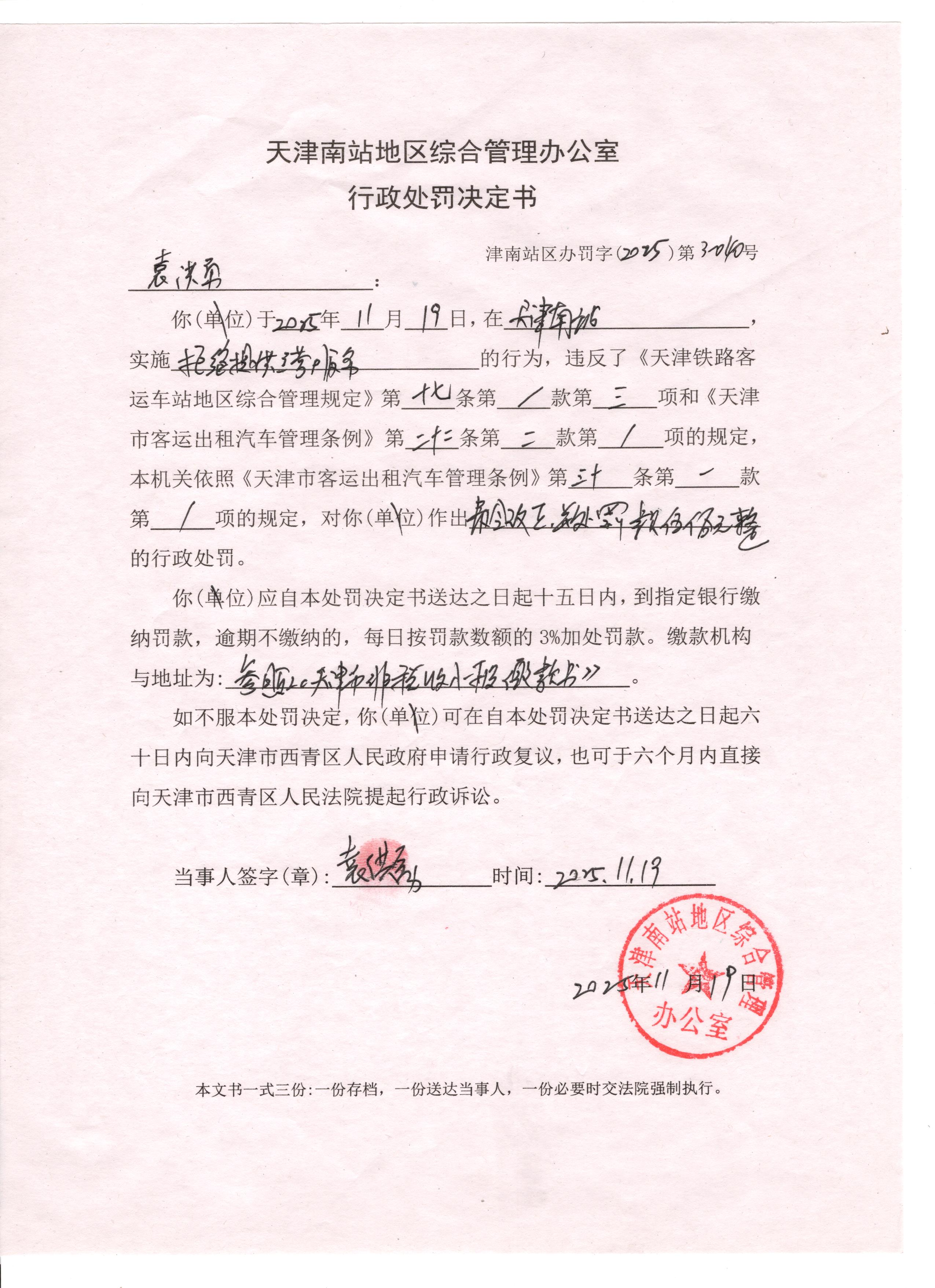 天津南站地区综合管理办公室行政执法决定公示