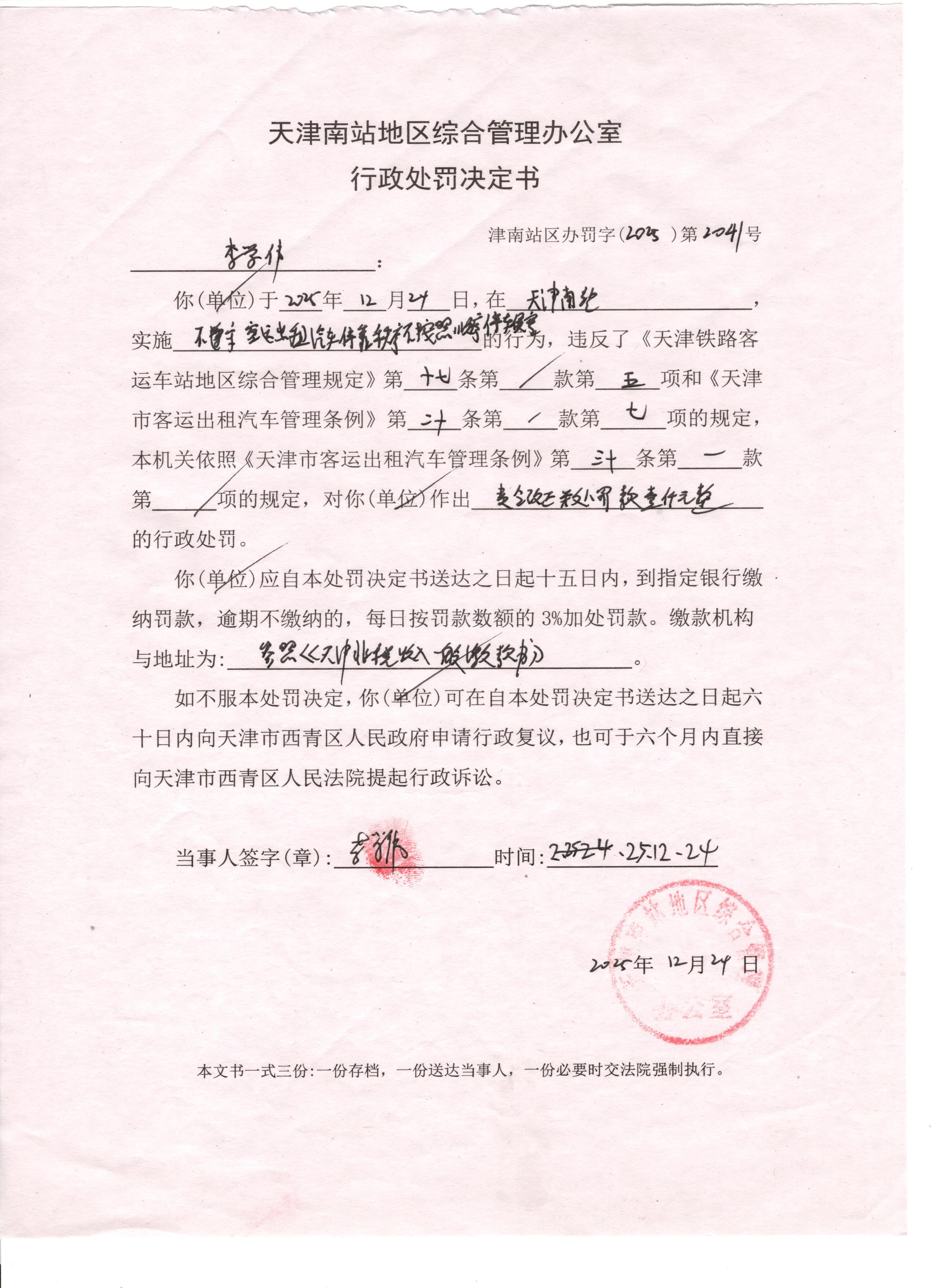 天津南站地区综合管理办公室行政执法决定公示