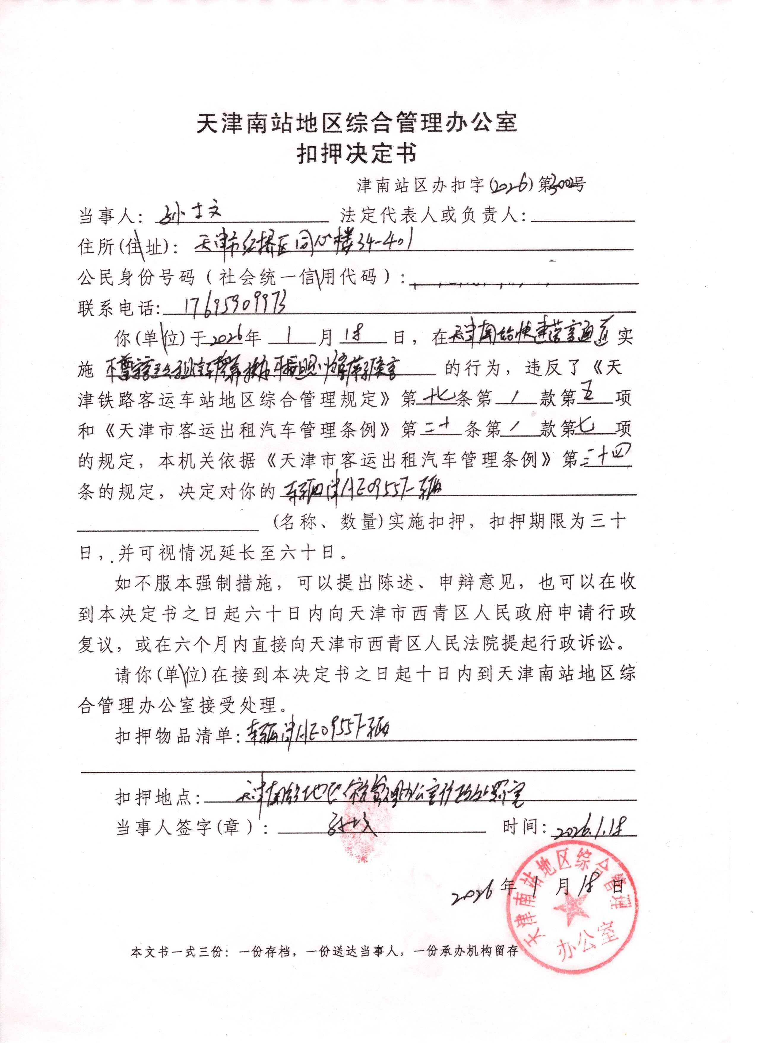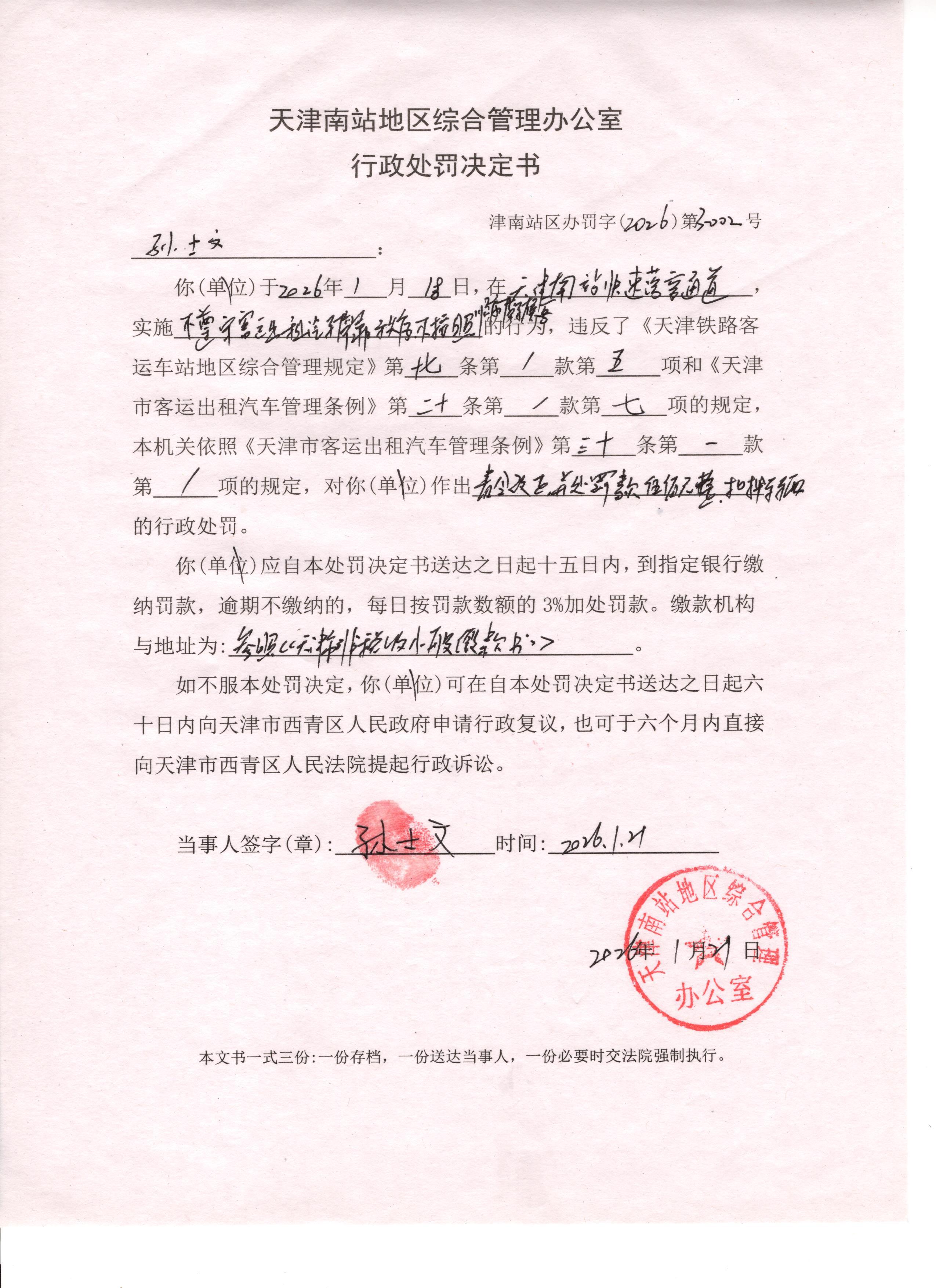 天津南站地区综合管理办公室行政执法决定公示