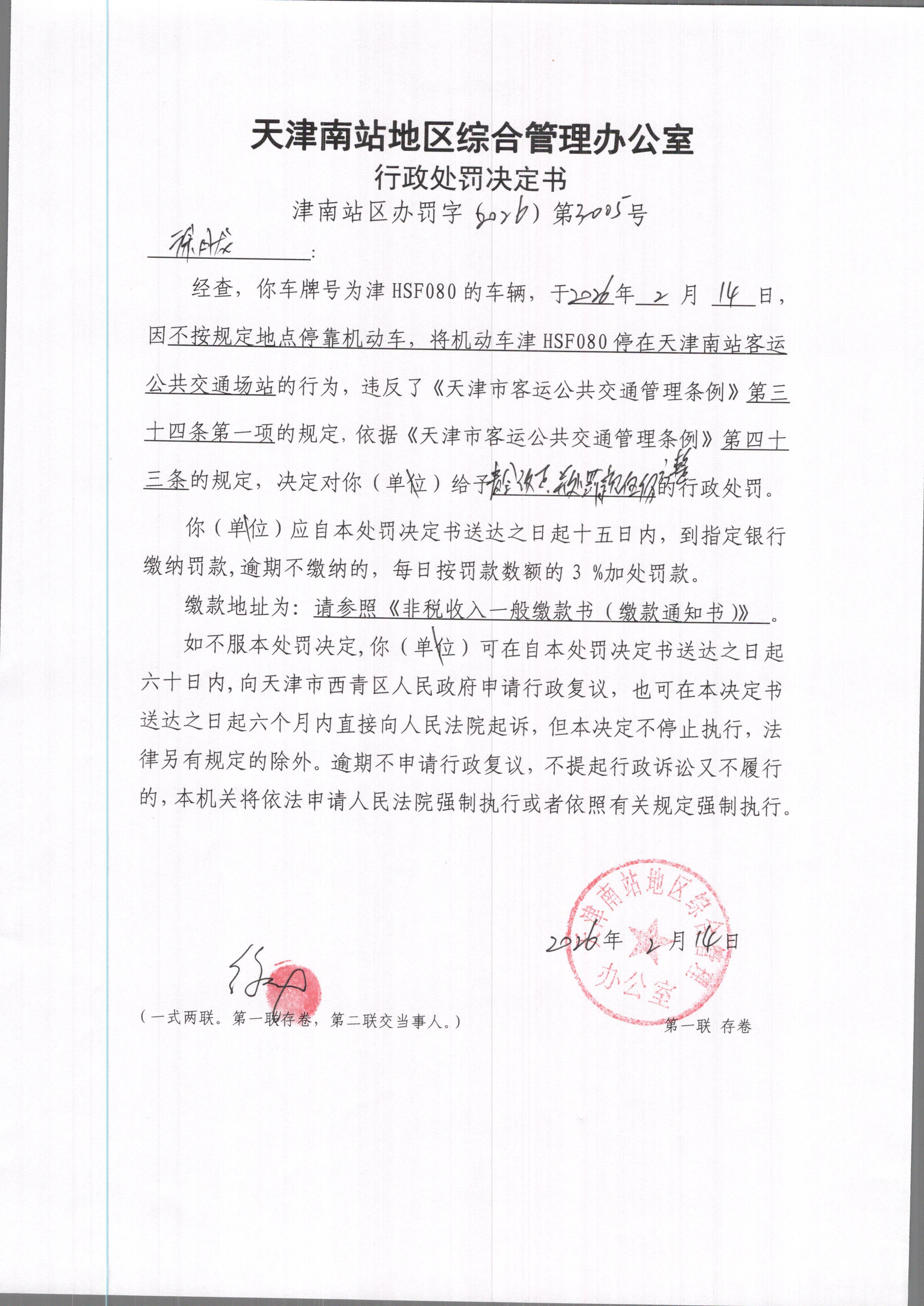 天津南站地区综合管理办公室行政执法决定公示
