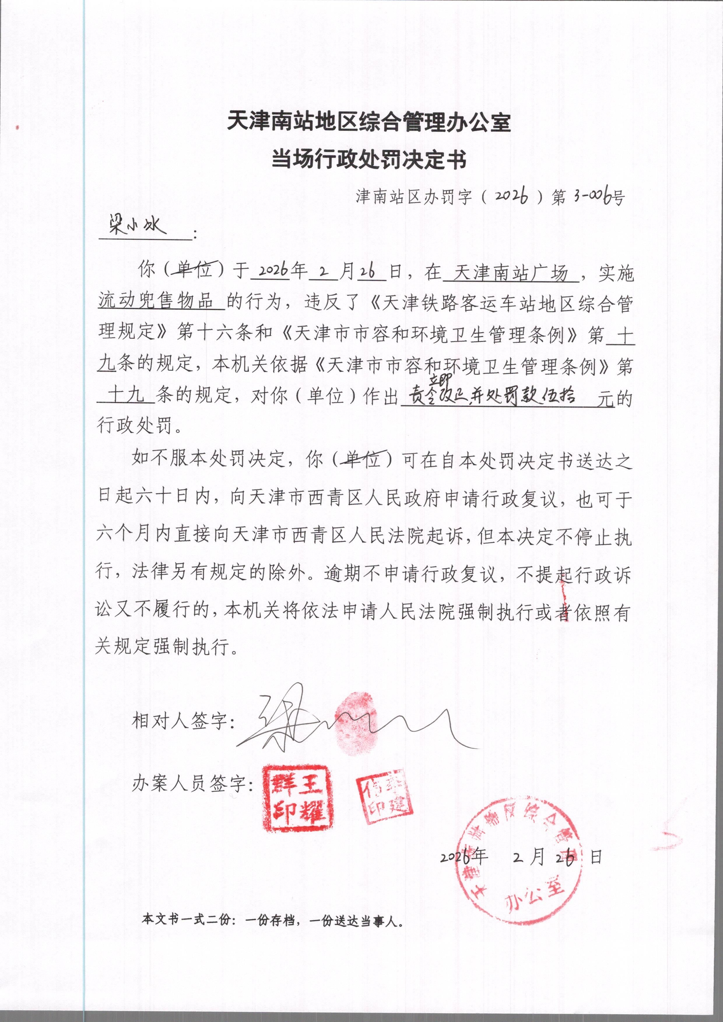 天津南站地区综合管理办公室行政执法决定公示