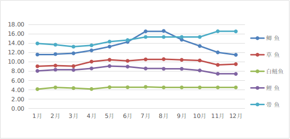 全年水产品市场价格多数下降。水产品平均零售价格分别为鲫鱼13.32元/500克、草鱼9.88元/500克、白鲢鱼4.44元/500克、鲤鱼8.31元/500克、带鱼14.82元/500克。与去年价格相比,草鱼、白鲢鱼、鲤鱼和带鱼价格分别下降0.38%、4.87%、8.80%和0.25%,鲫鱼价格上涨0.57%。
