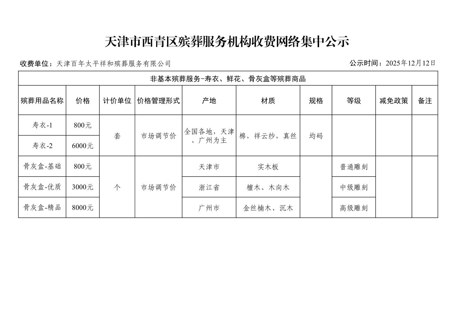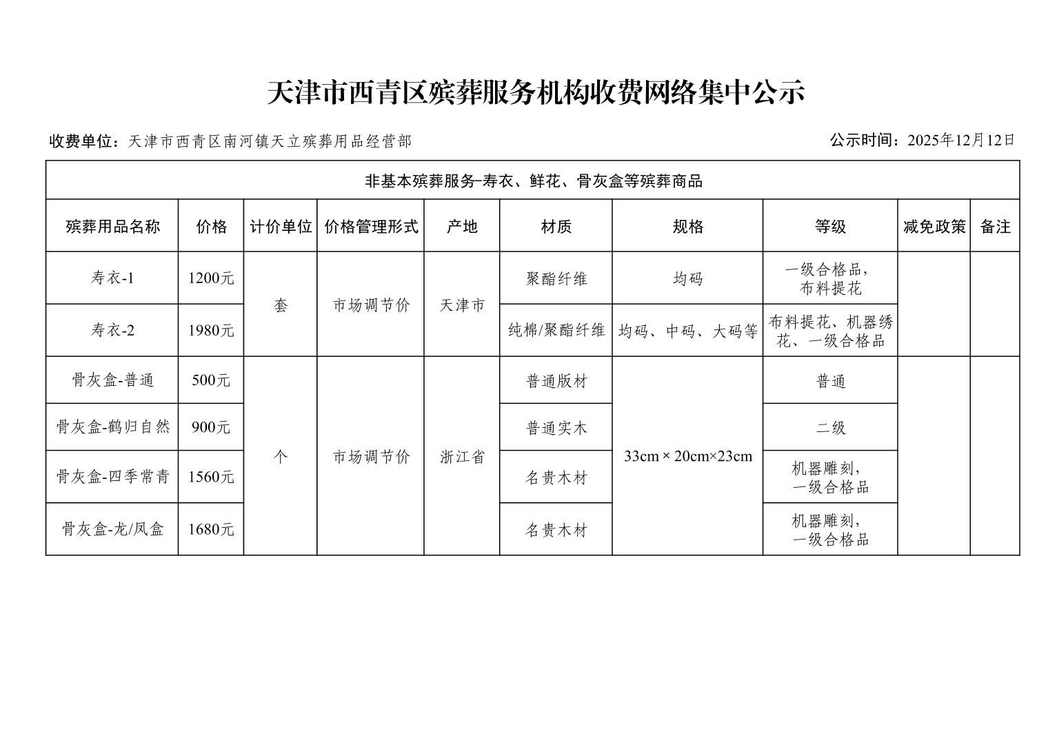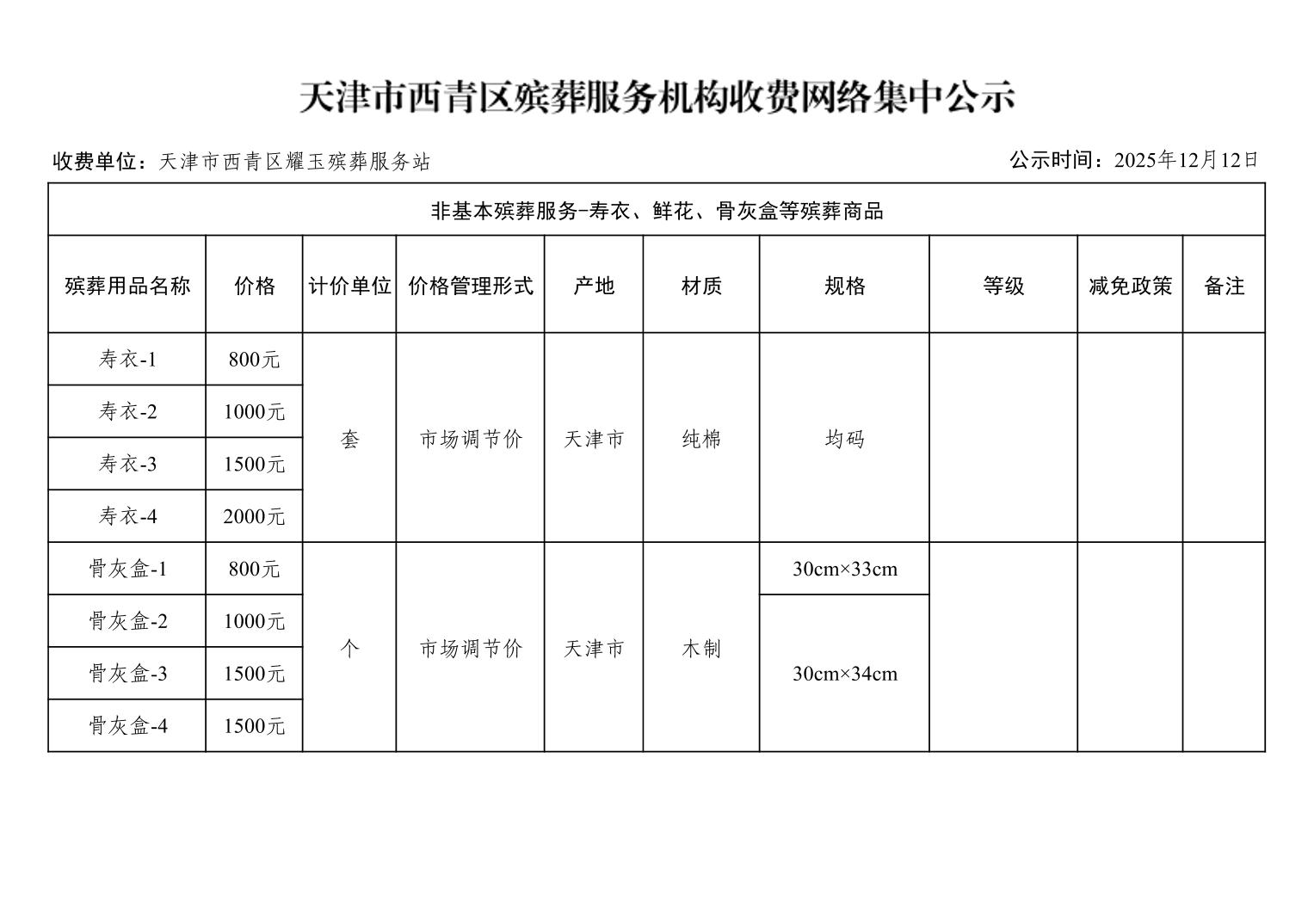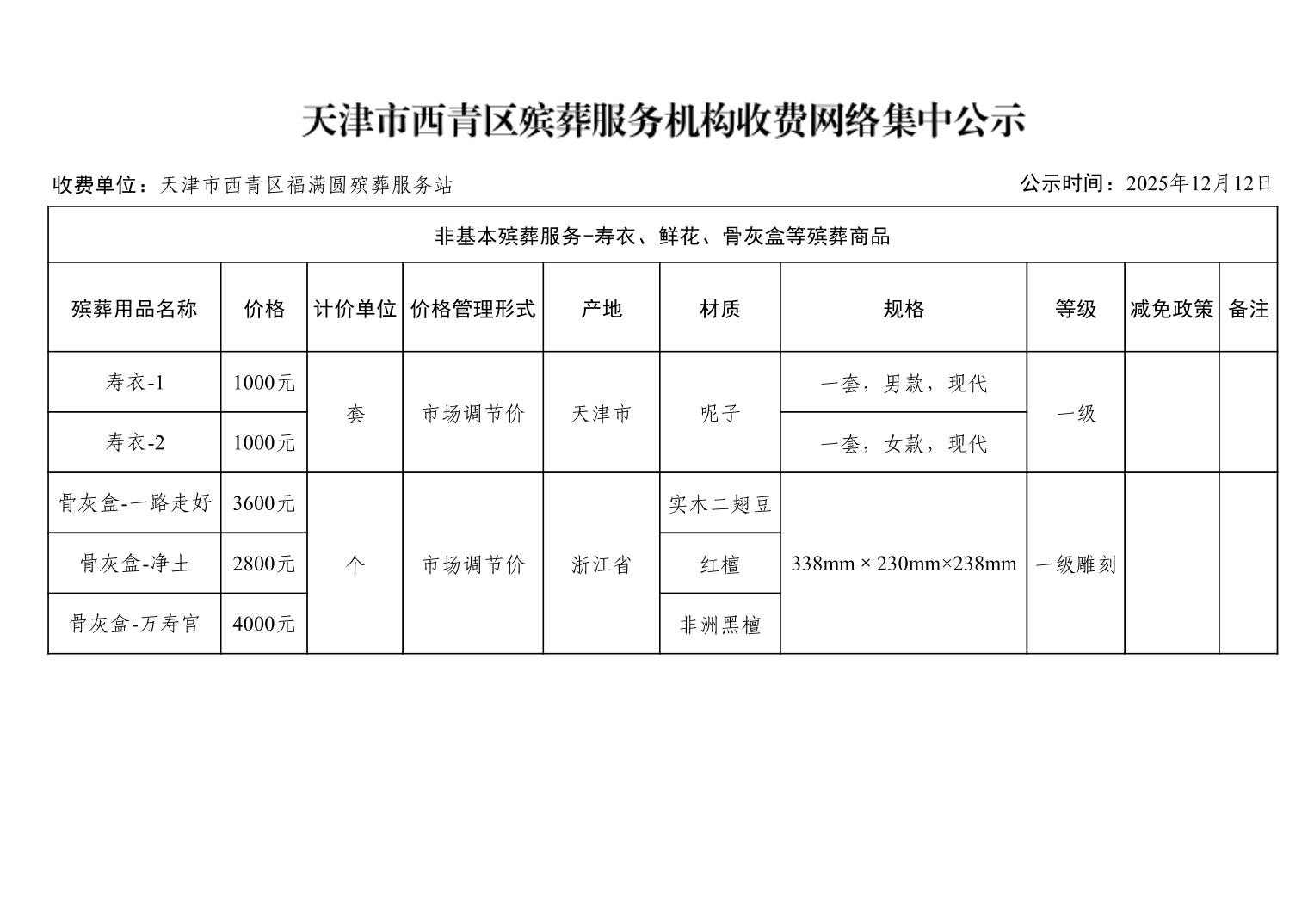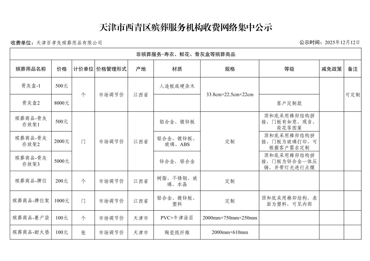 天津市西青区殡葬服务机构收费网络集中公示(殡葬市场经营主体)