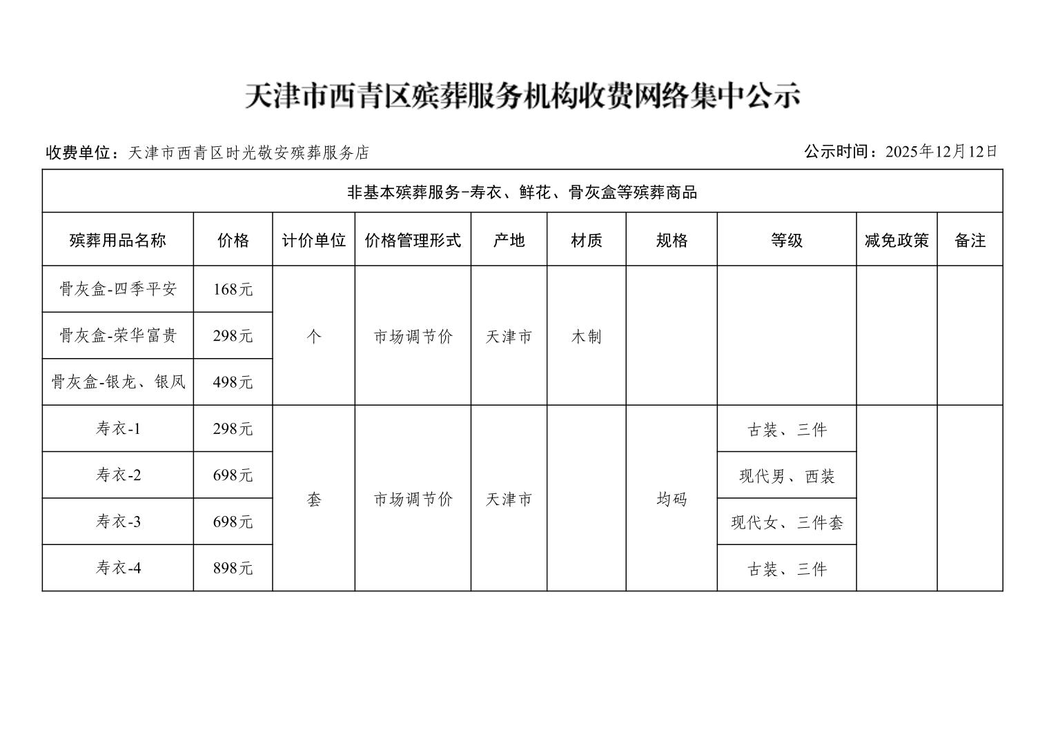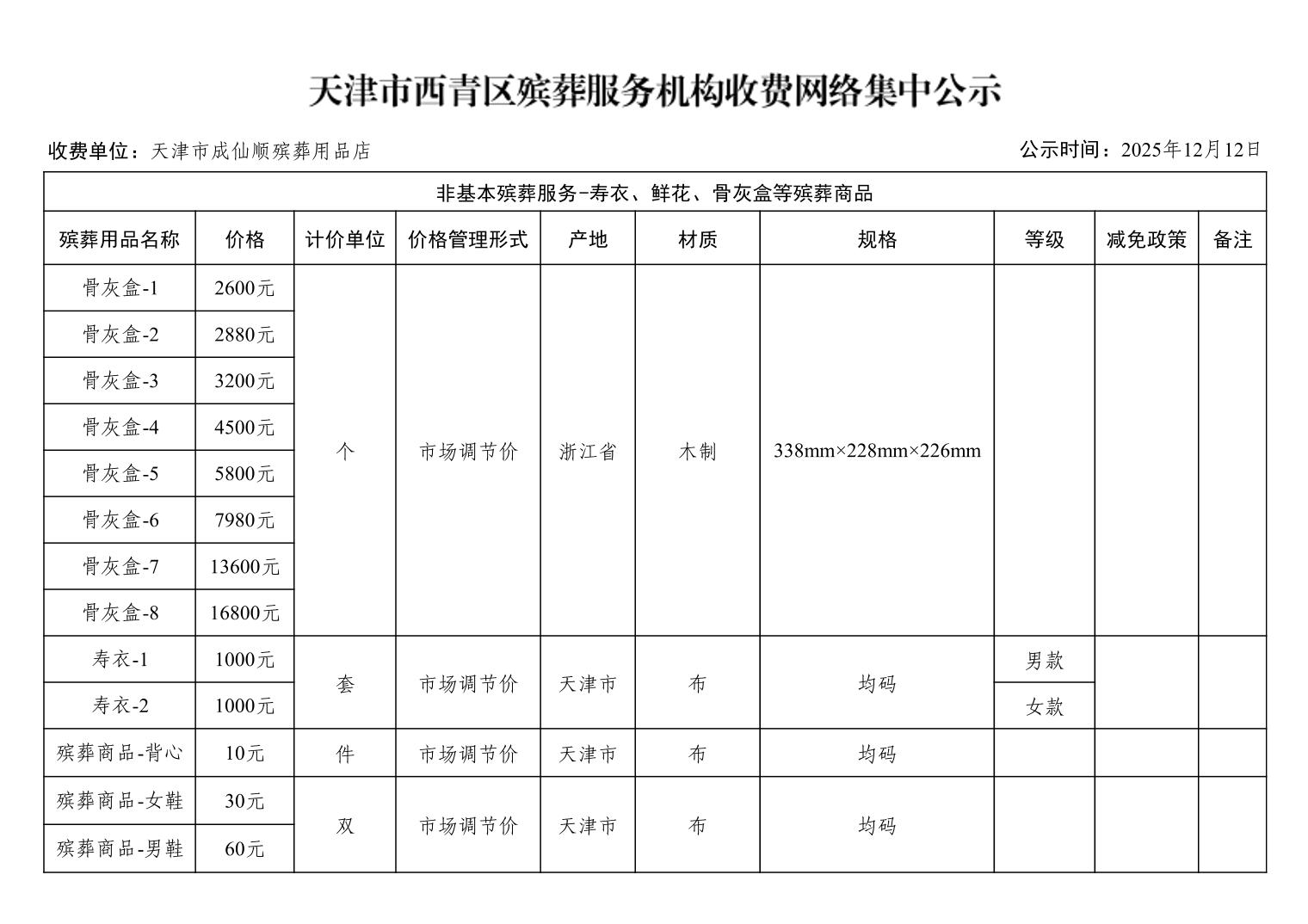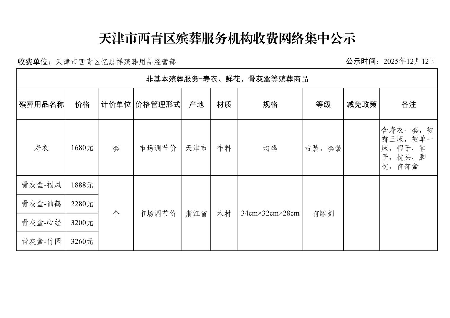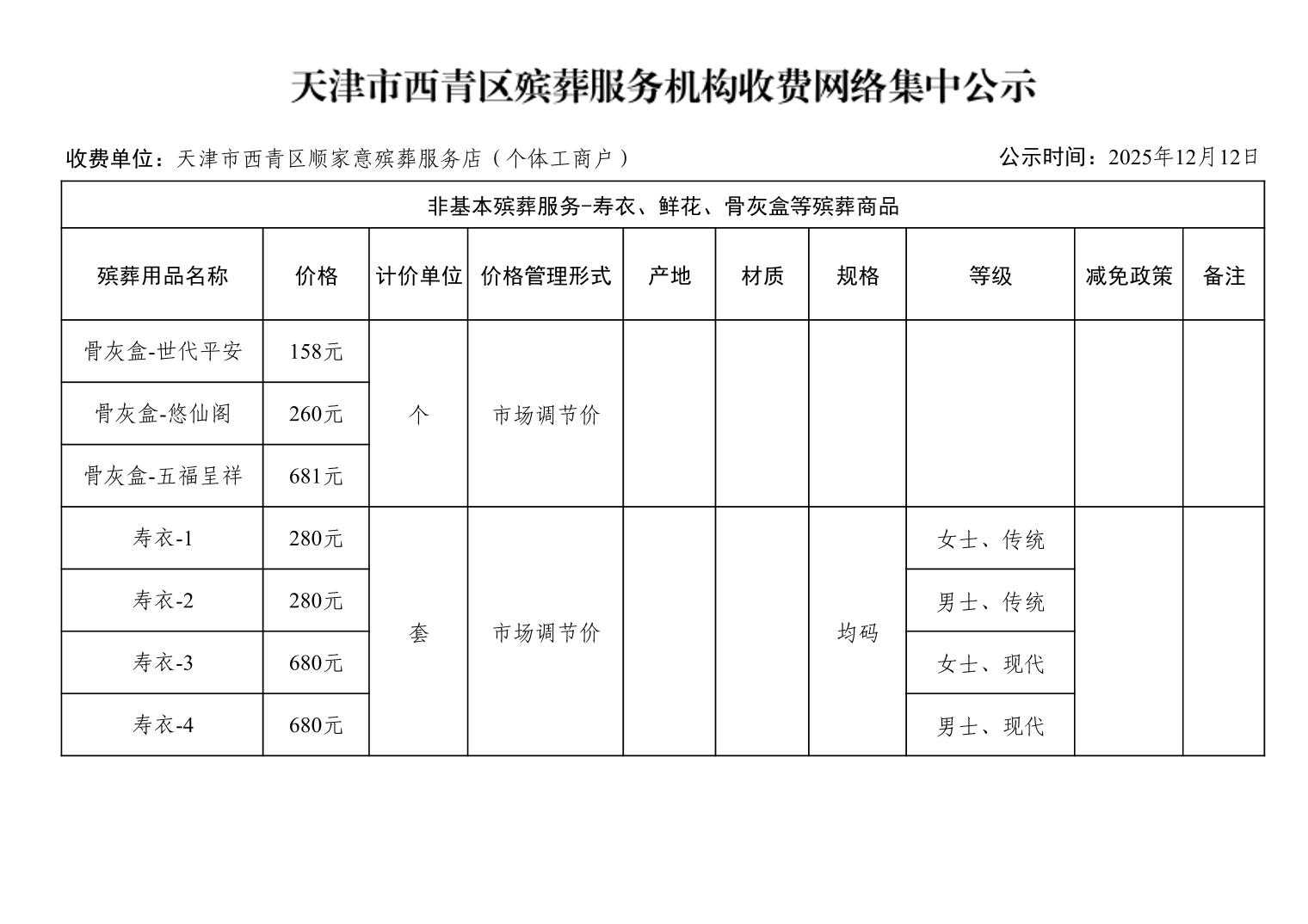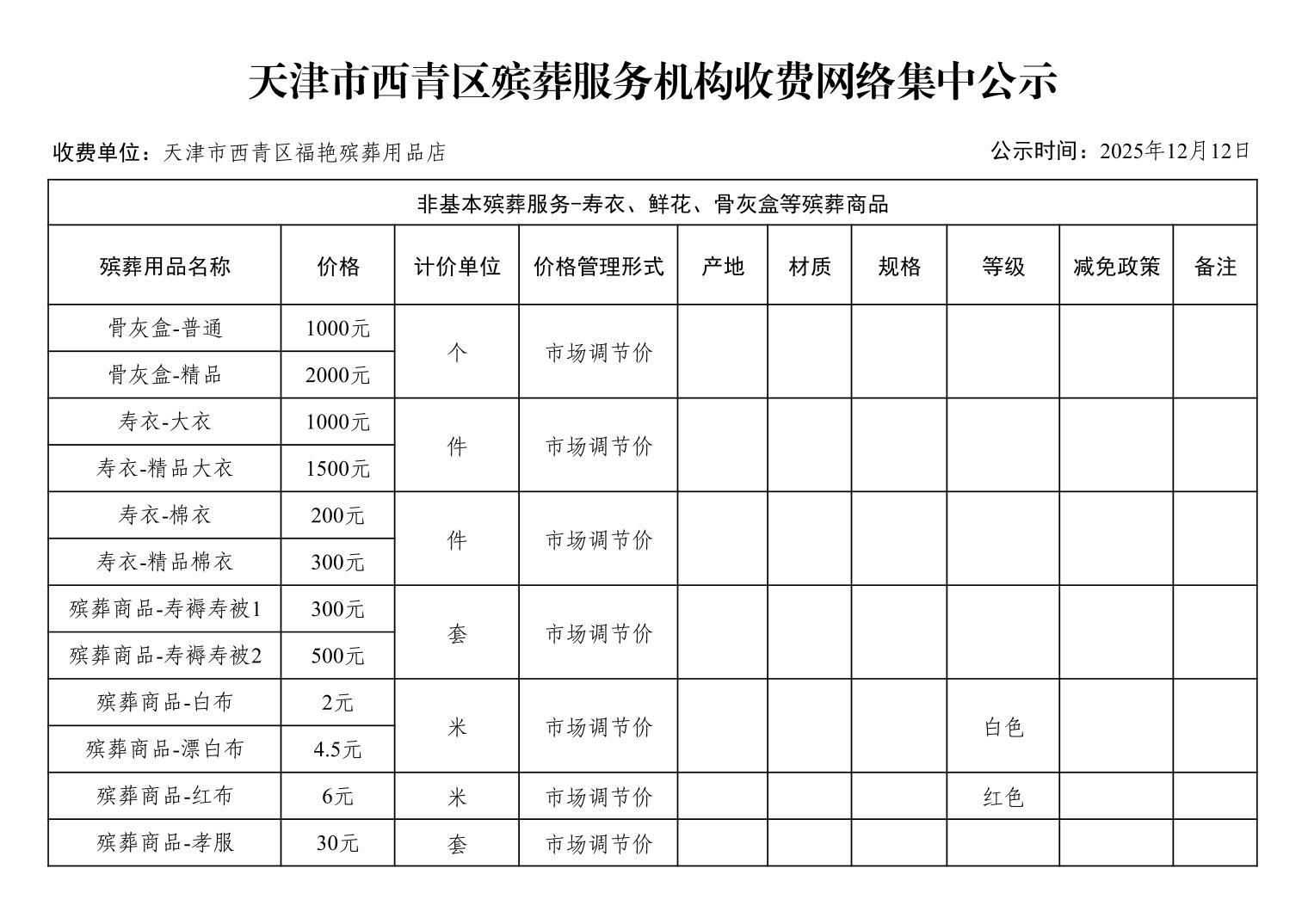 天津市西青区殡葬服务机构收费网络集中公示(殡葬市场经营主体)