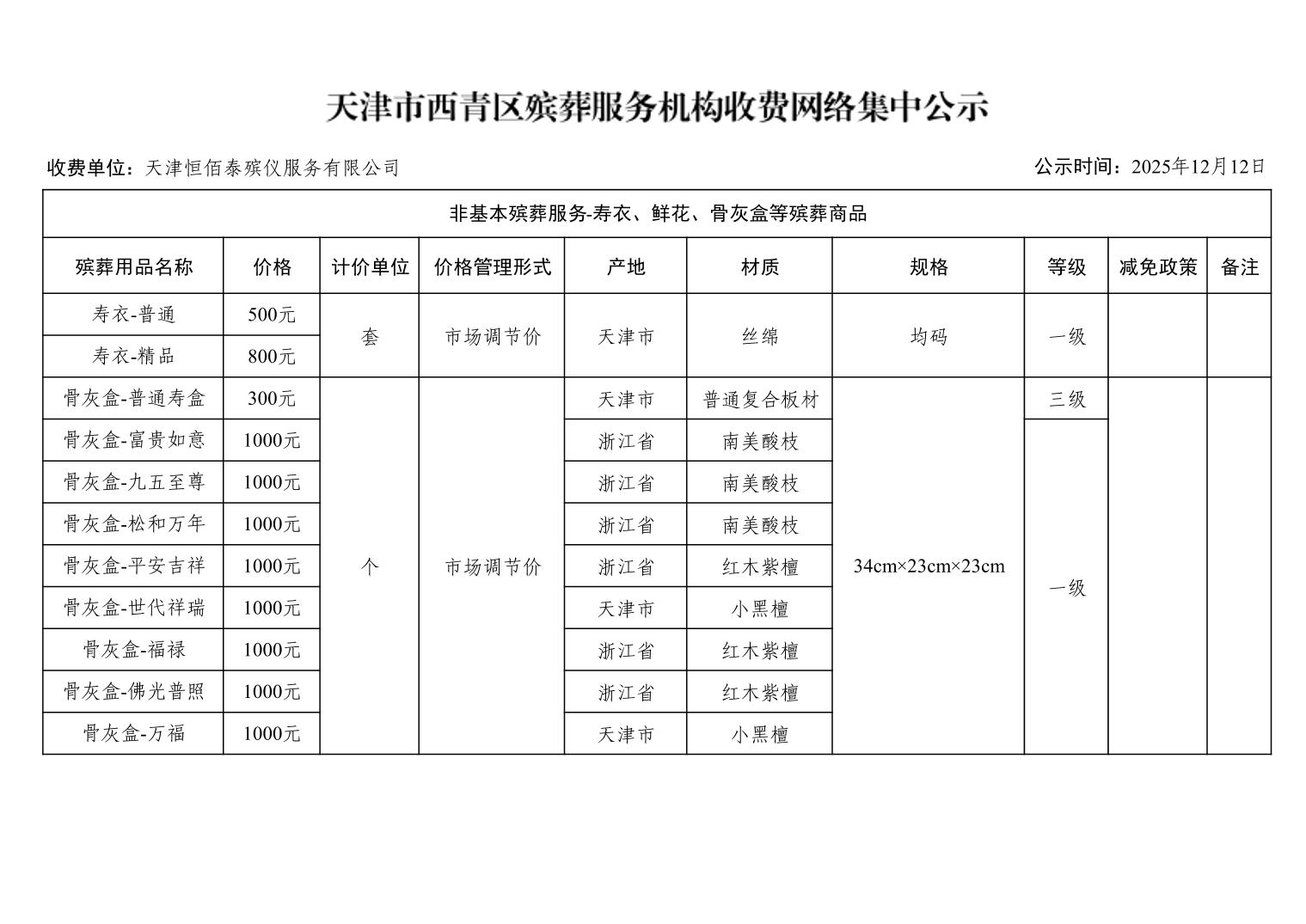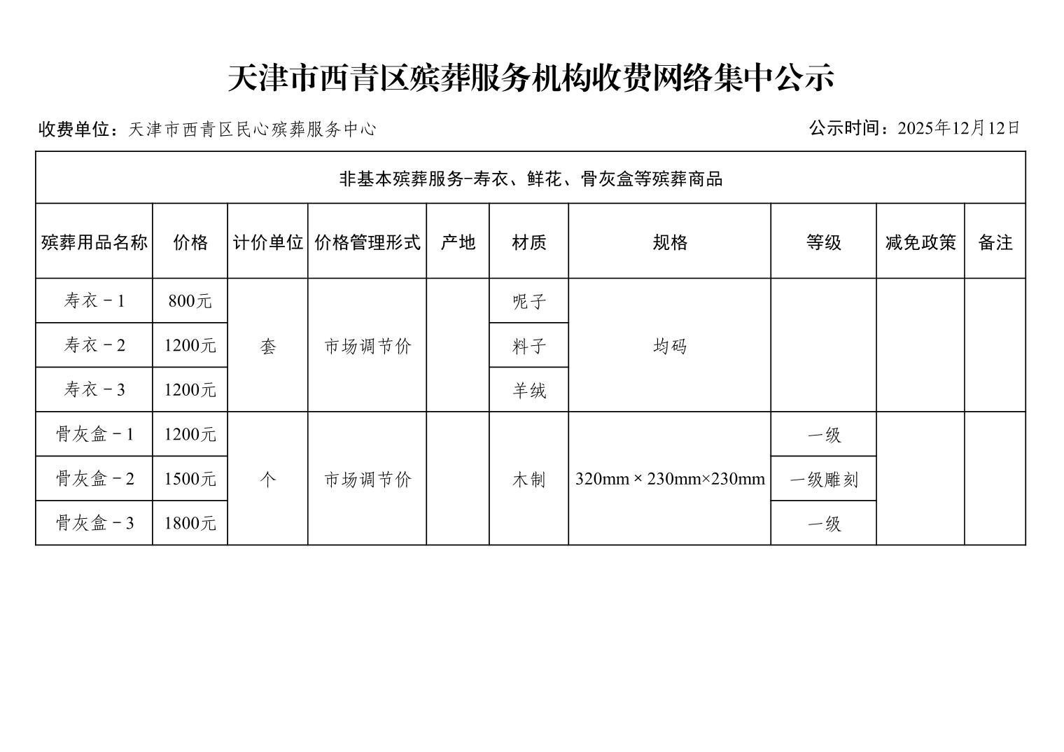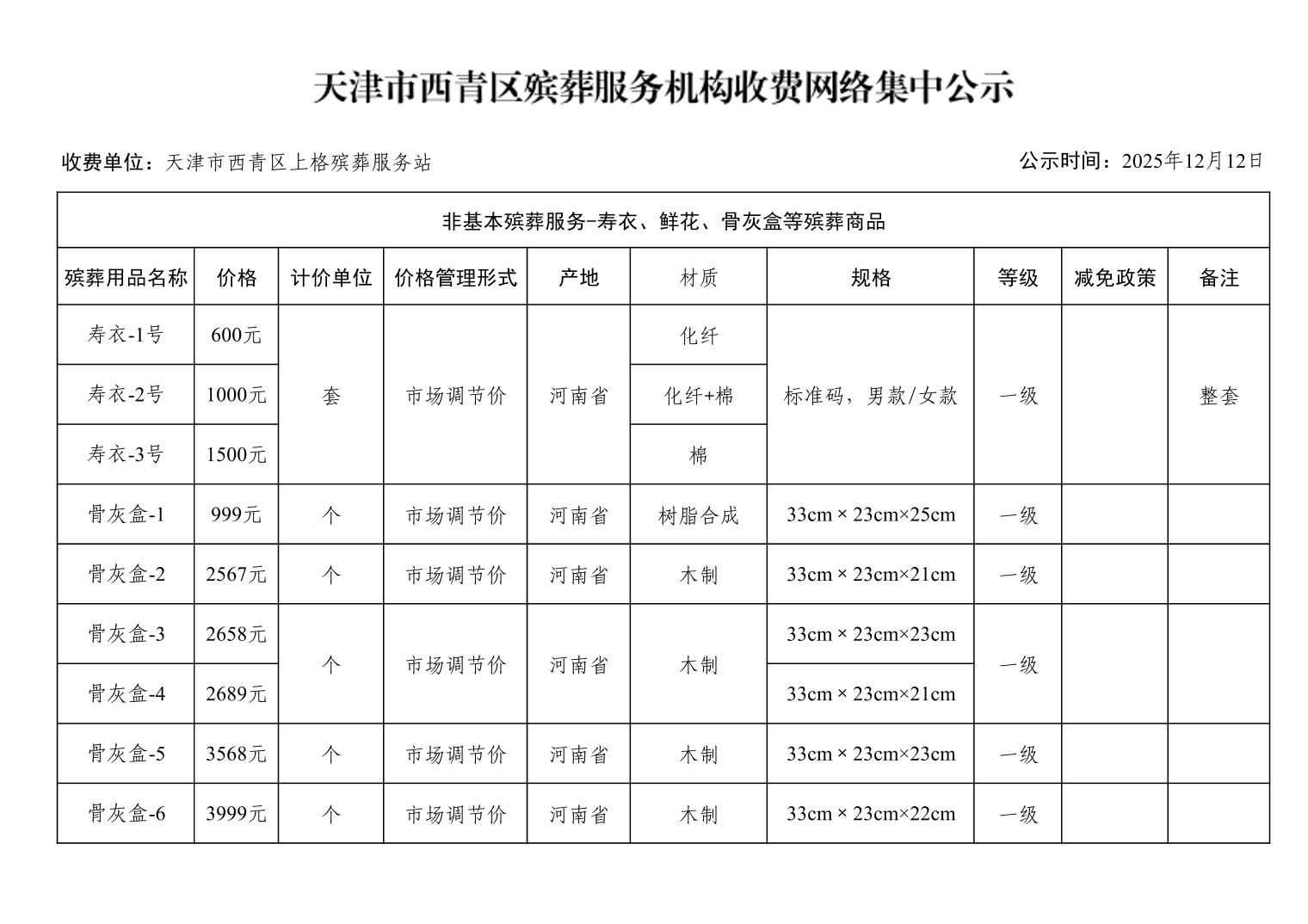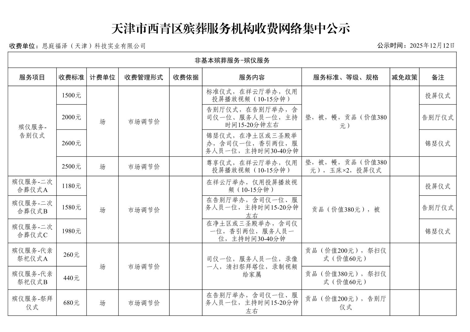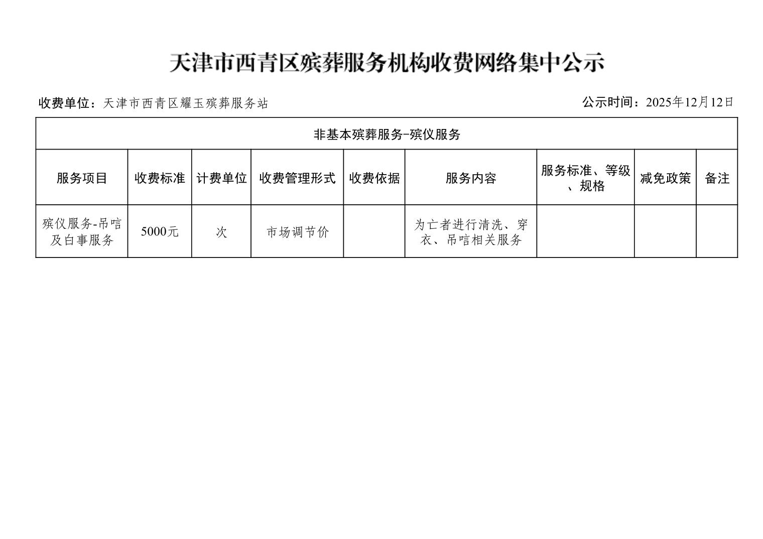 天津市西青区殡葬服务机构收费网络集中公示(殡葬市场经营主体)