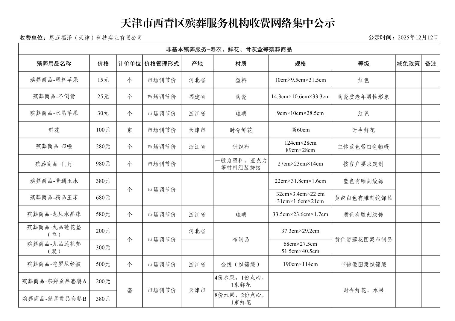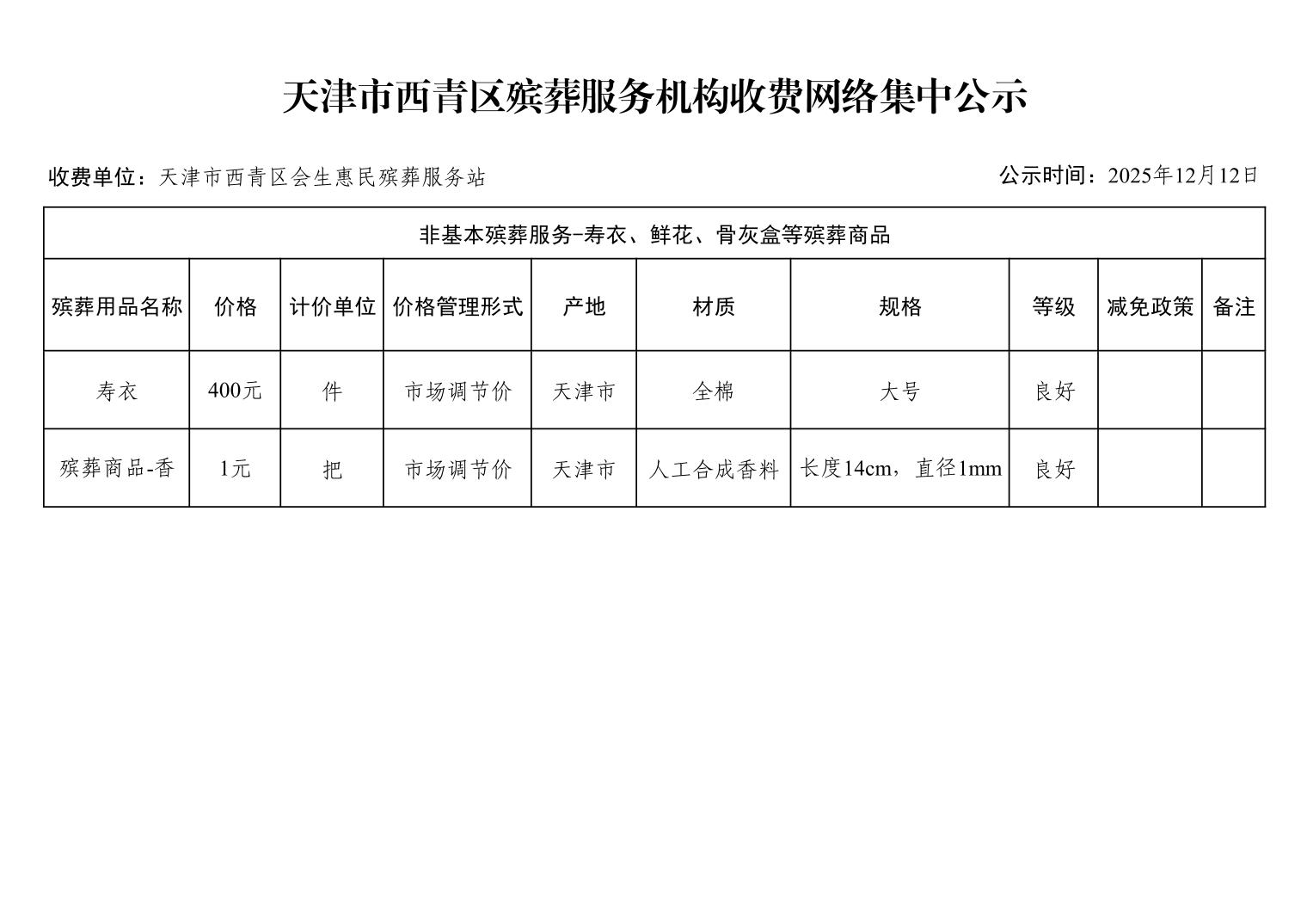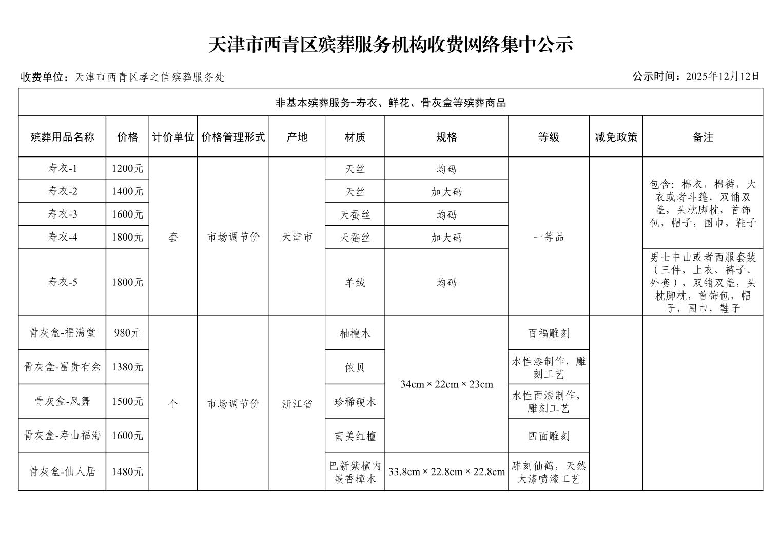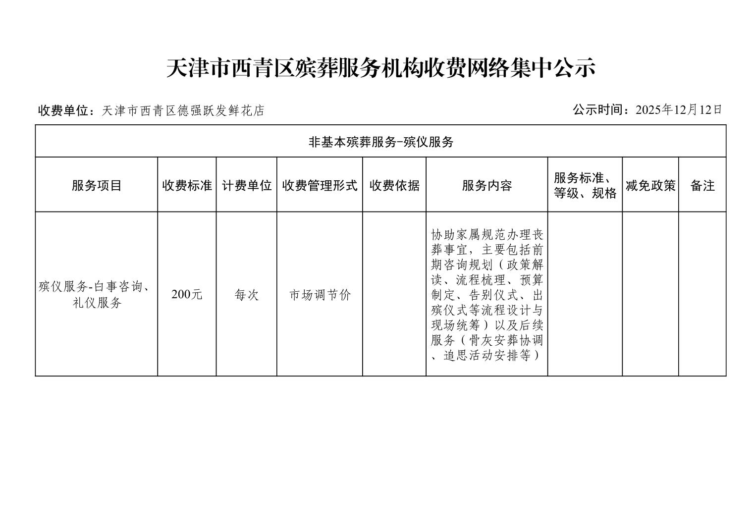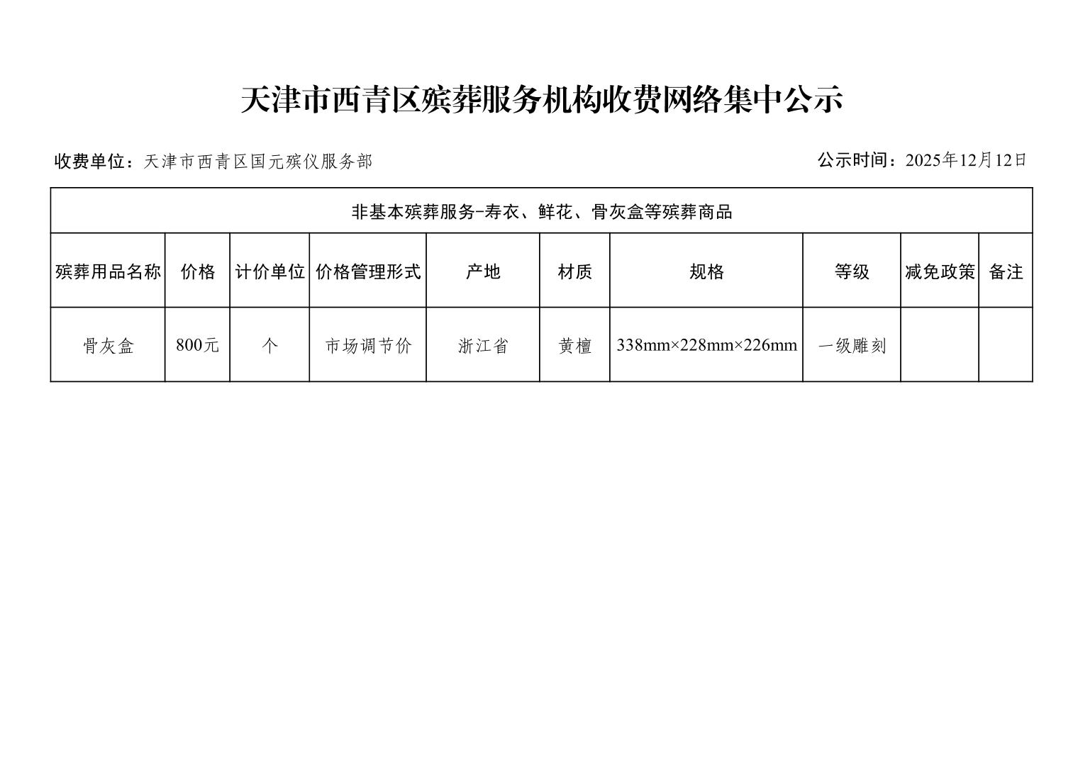 天津市西青区殡葬服务机构收费网络集中公示(殡葬市场经营主体)