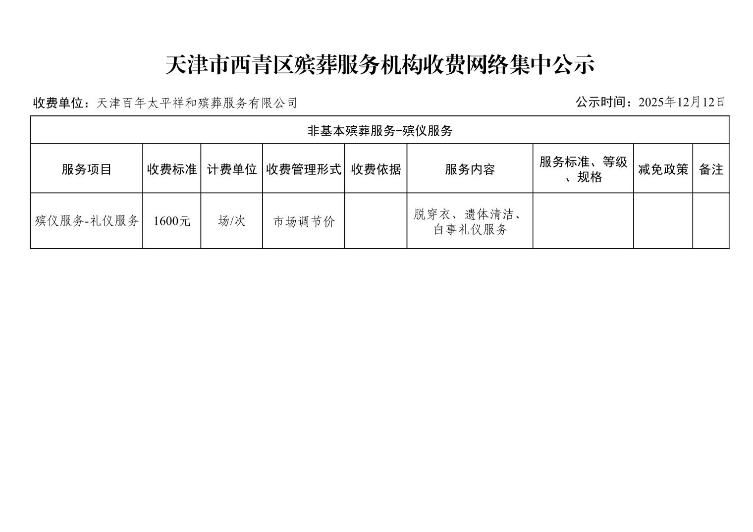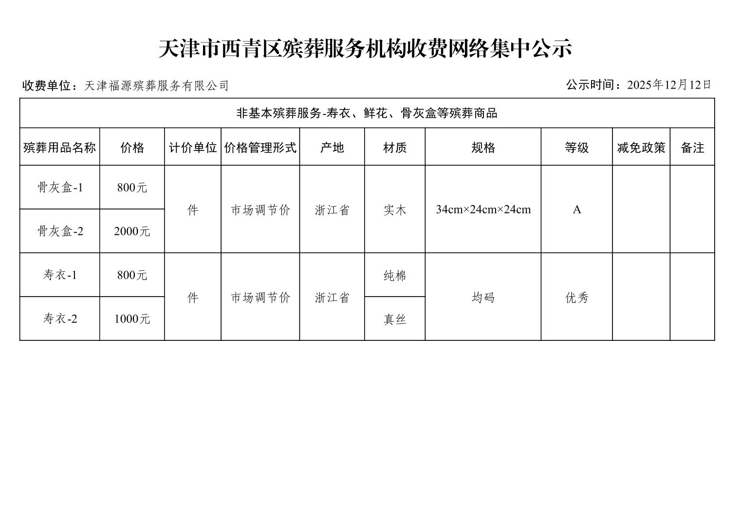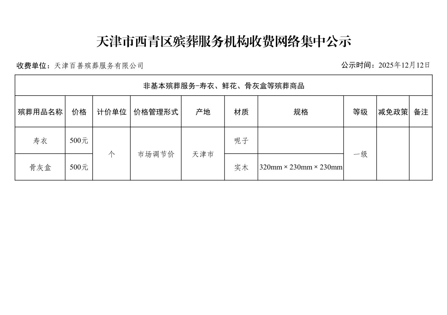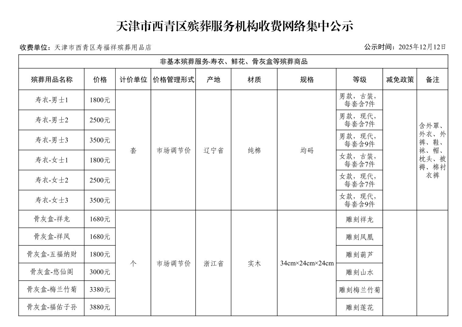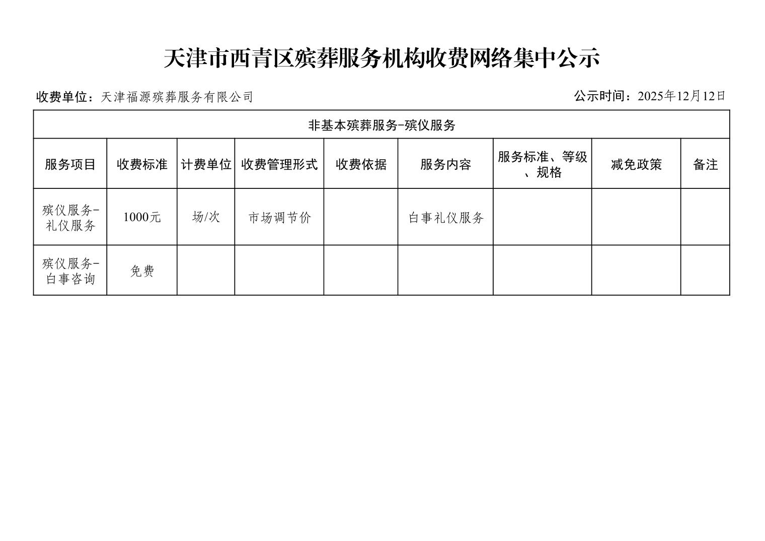 天津市西青区殡葬服务机构收费网络集中公示(殡葬市场经营主体)