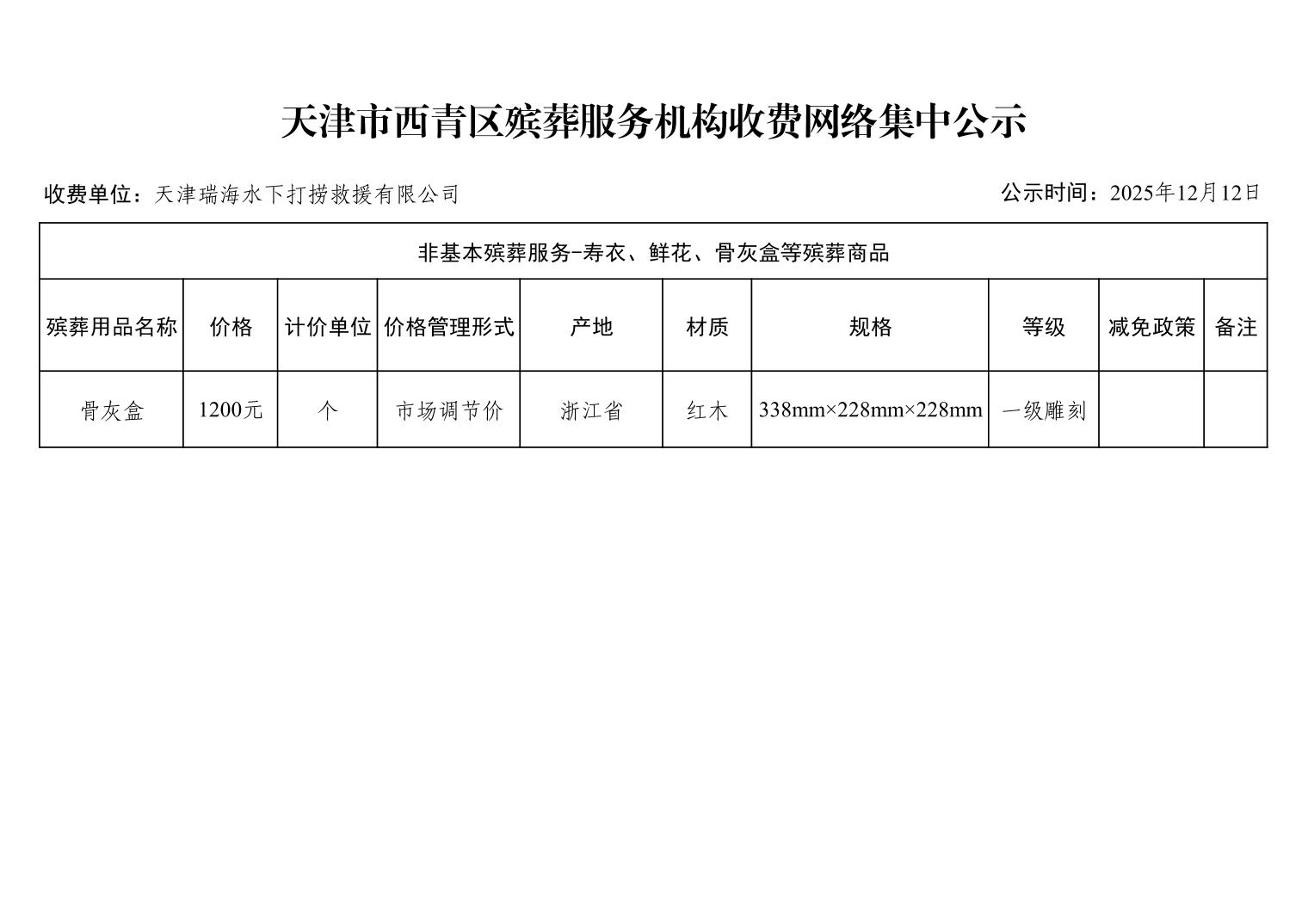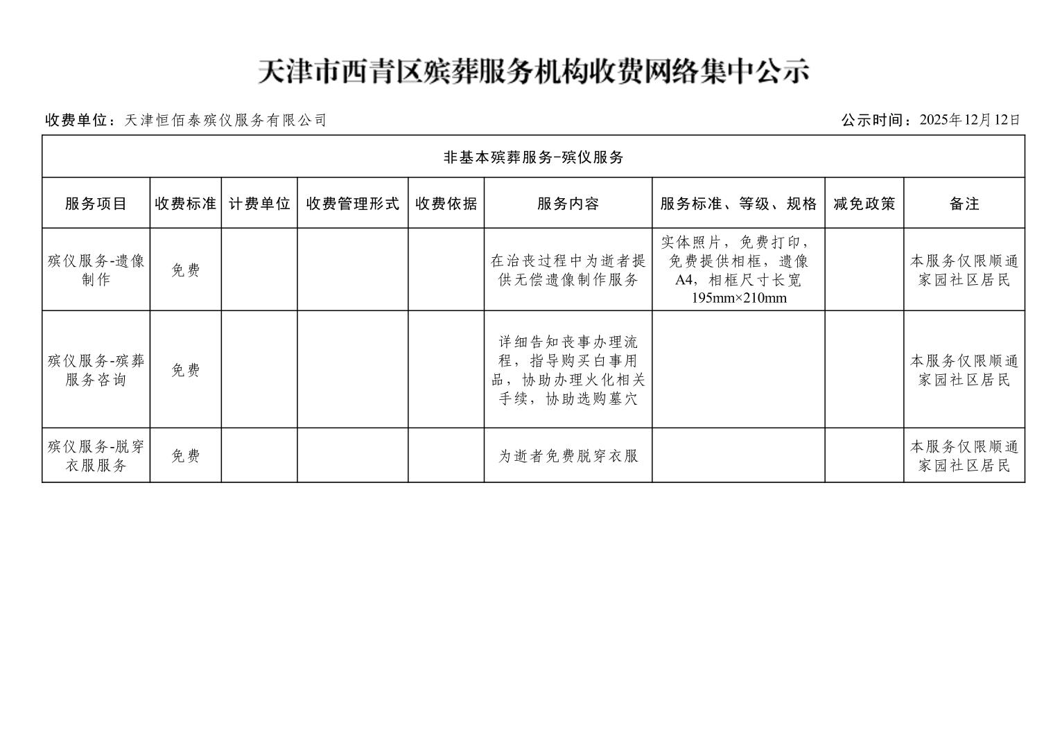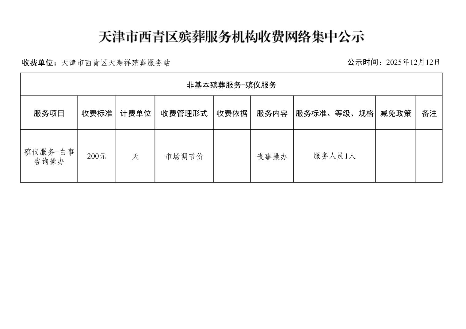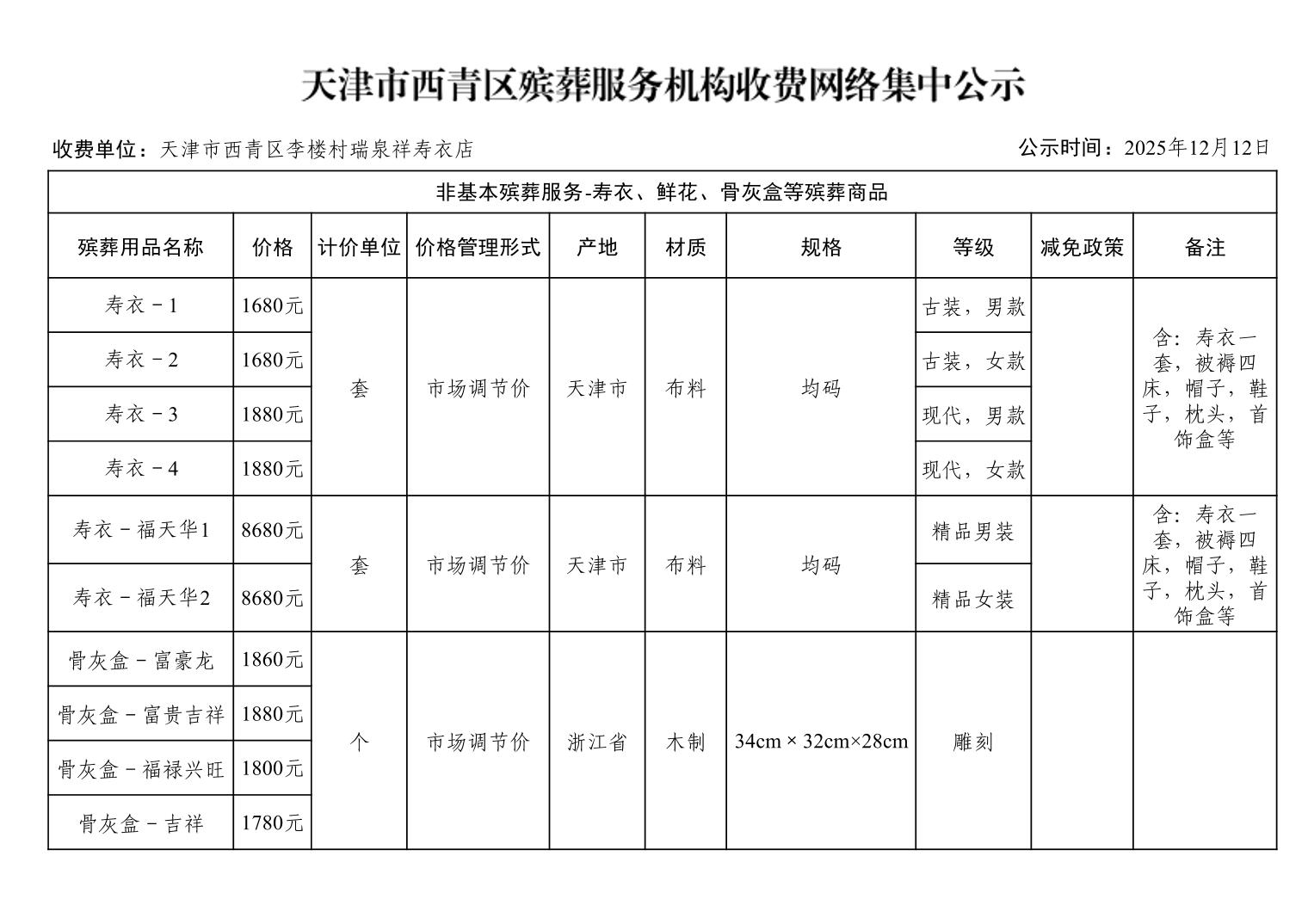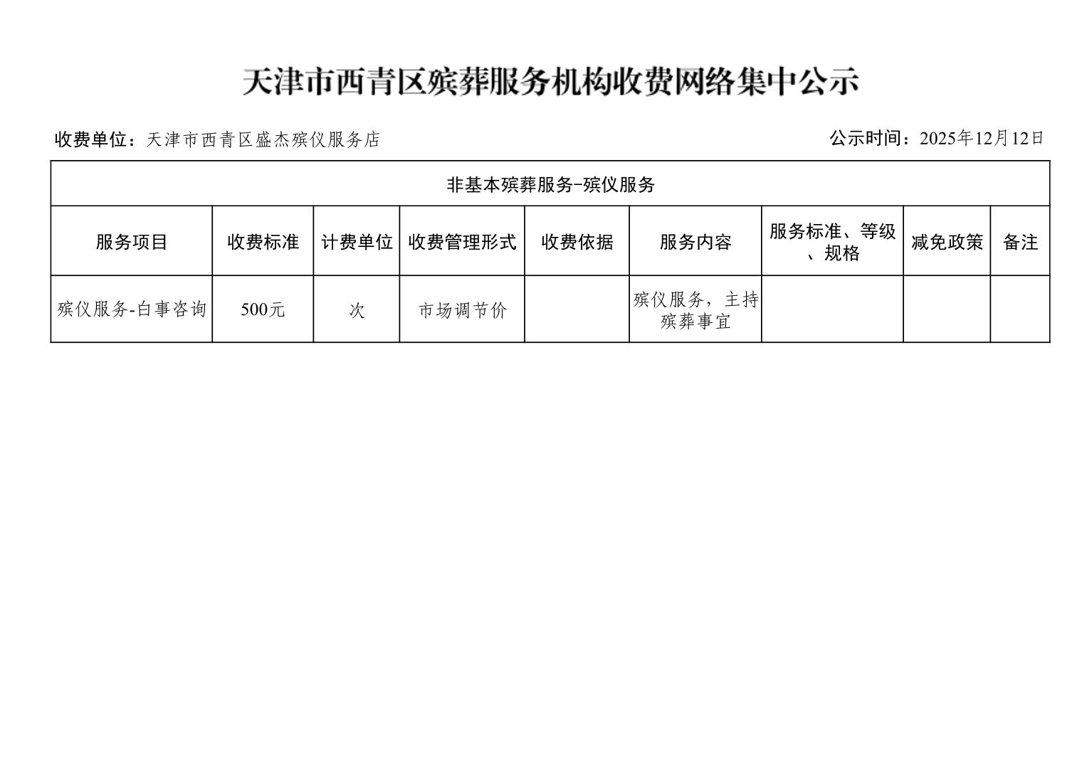 天津市西青区殡葬服务机构收费网络集中公示(殡葬市场经营主体)