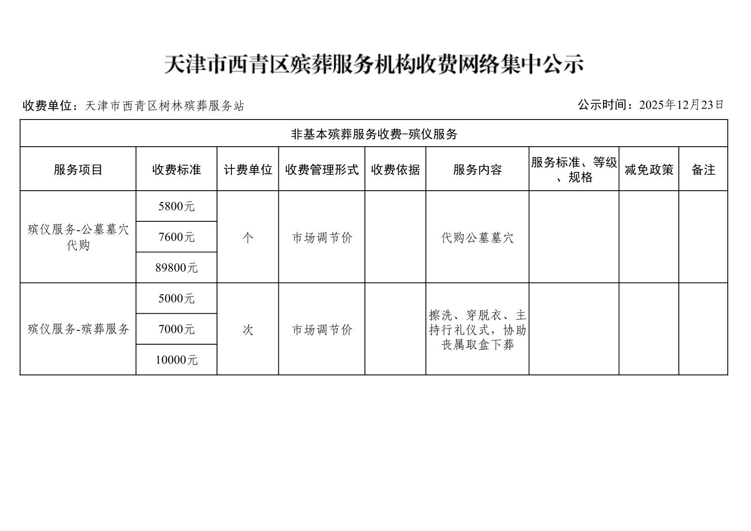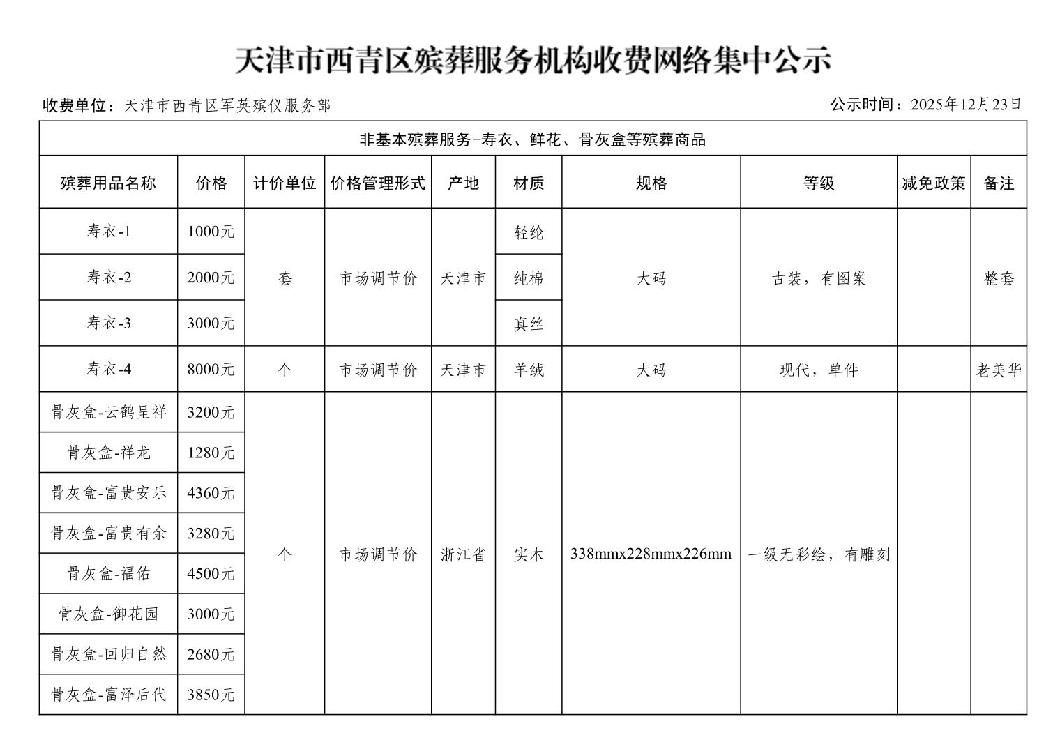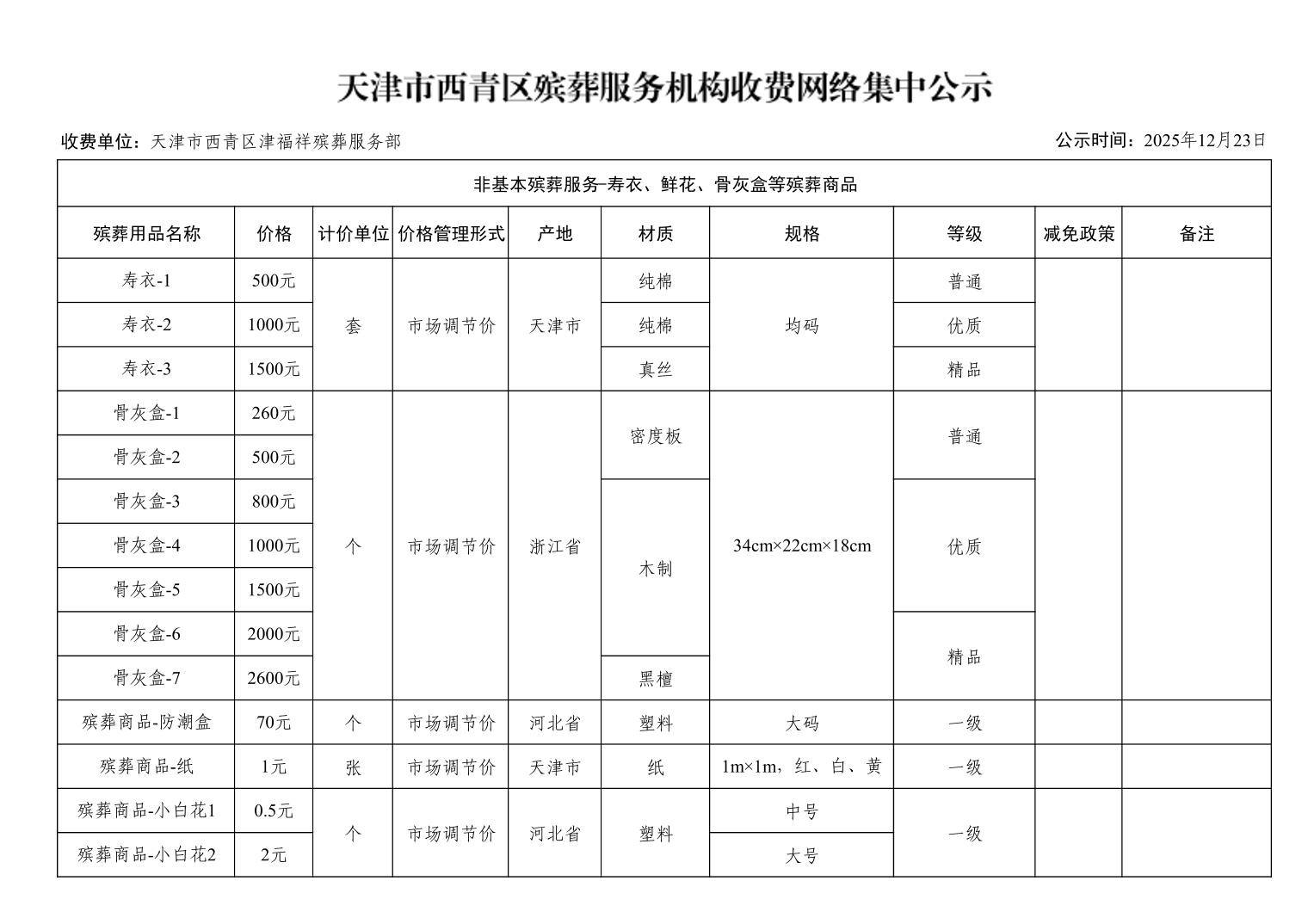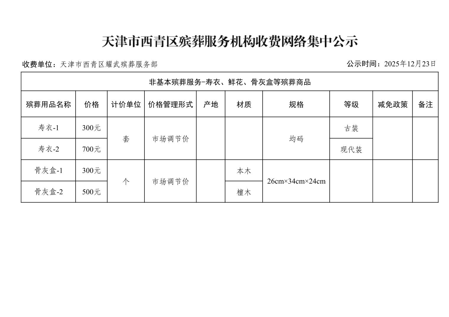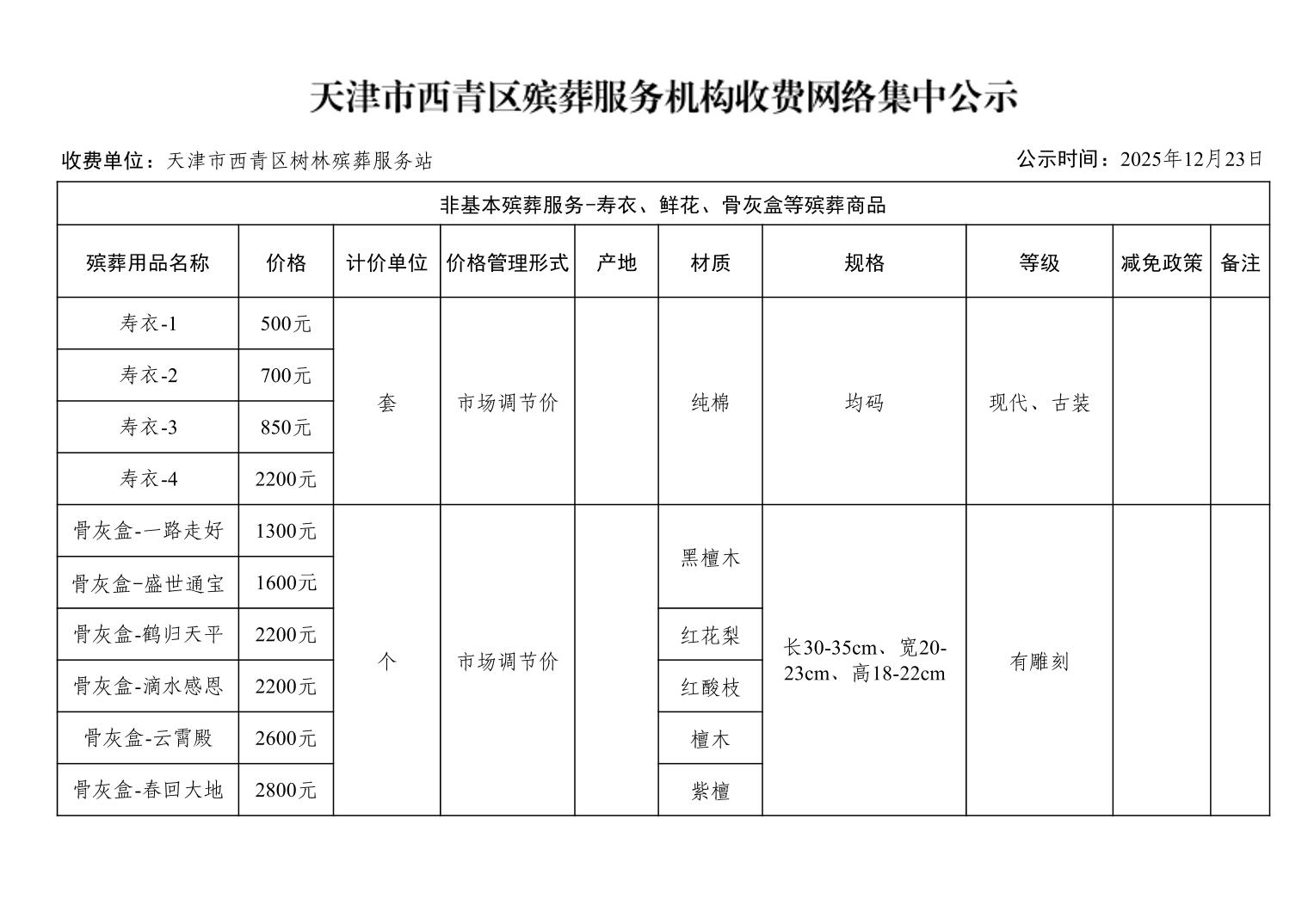 天津市西青区殡葬服务机构收费网络集中公示(殡葬市场经营主体)