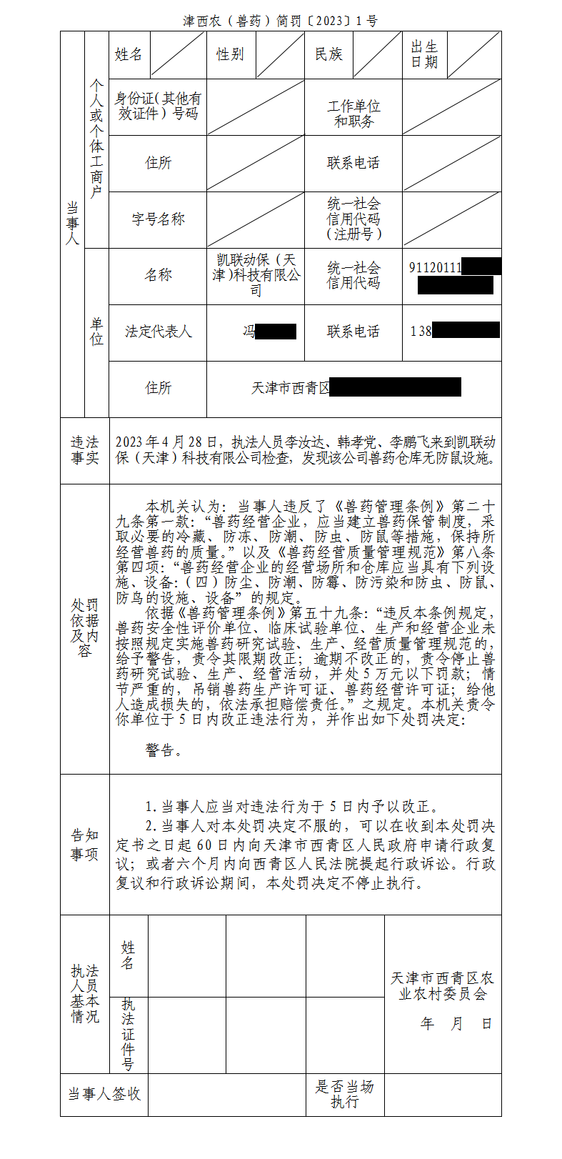 天津市西青区农业农村委员会当场行政处罚决定书