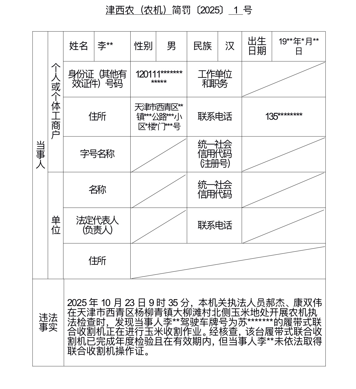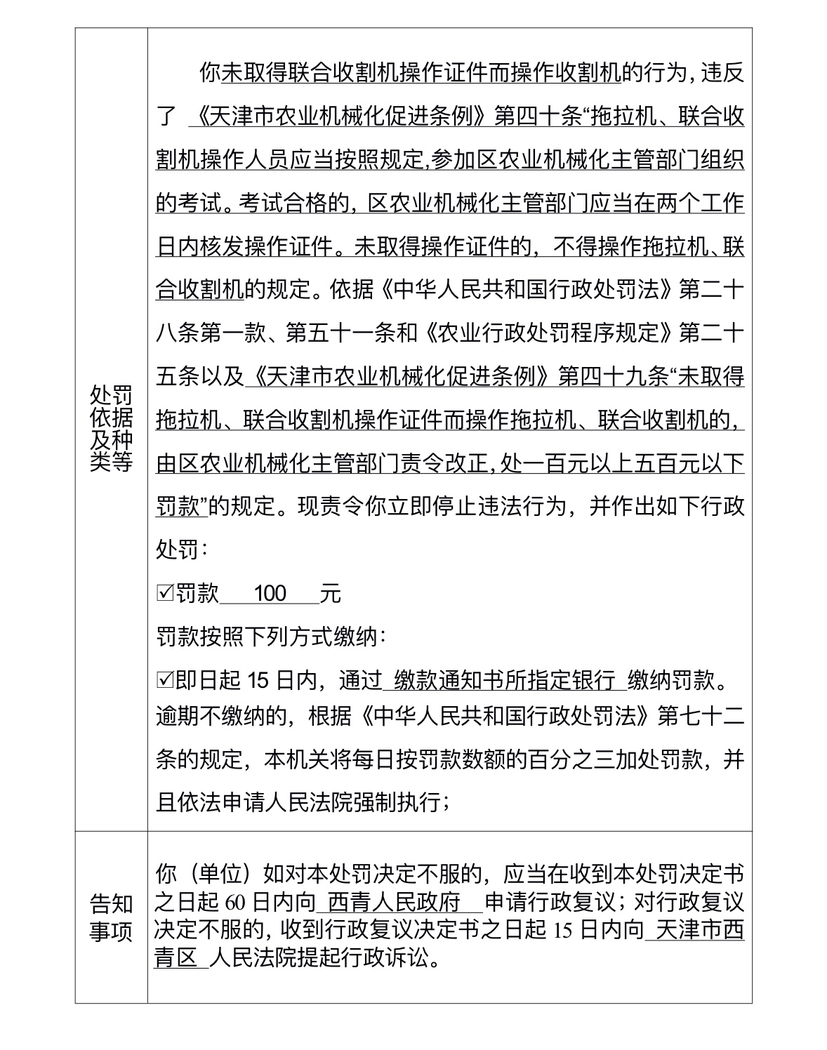 处罚地点:天津市西青区杨柳青镇大柳滩村北地头
