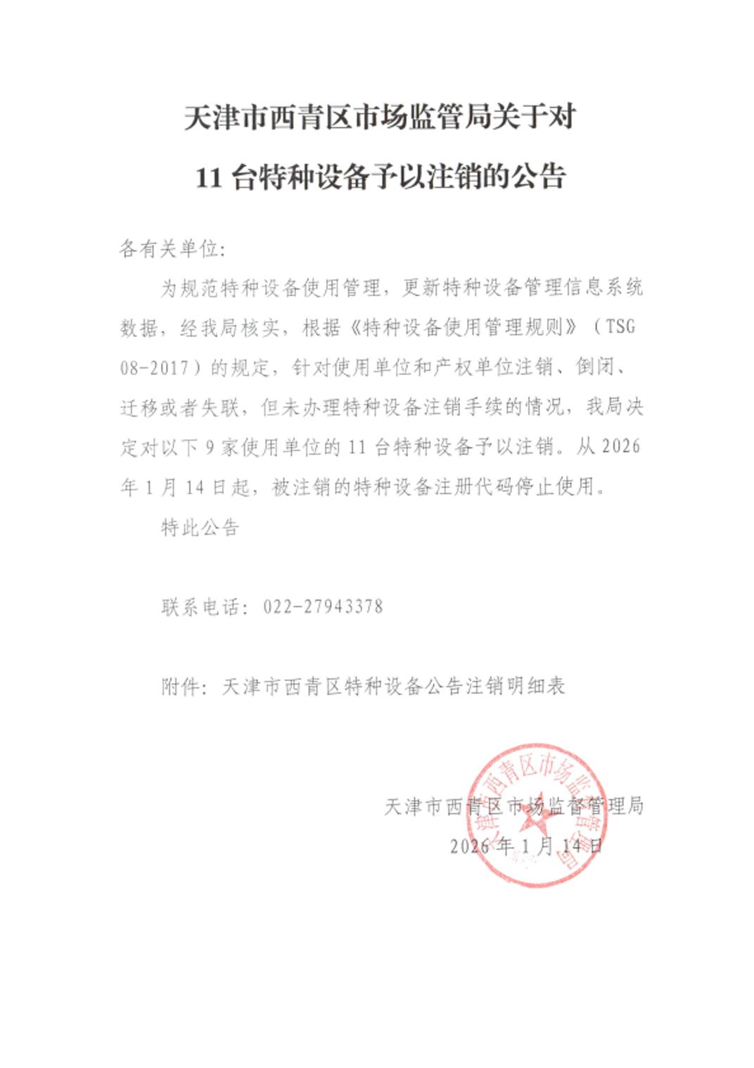天津市西青区市场监管局关于对 11台特种设备予以注销的公告