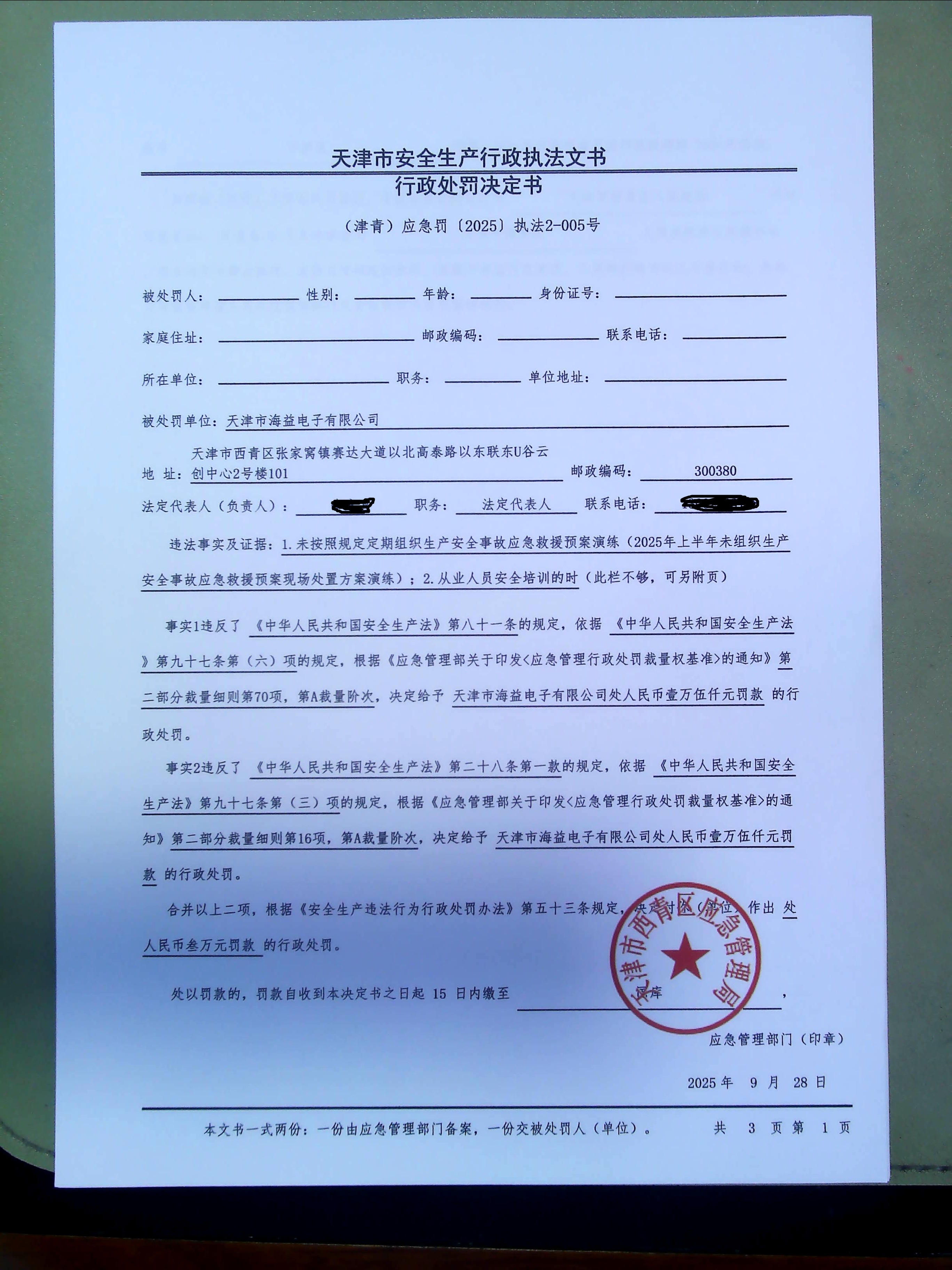 天津市西青区应急管理局 2025.9.28 (津青)应急罚﹝2025﹞执法2-005号