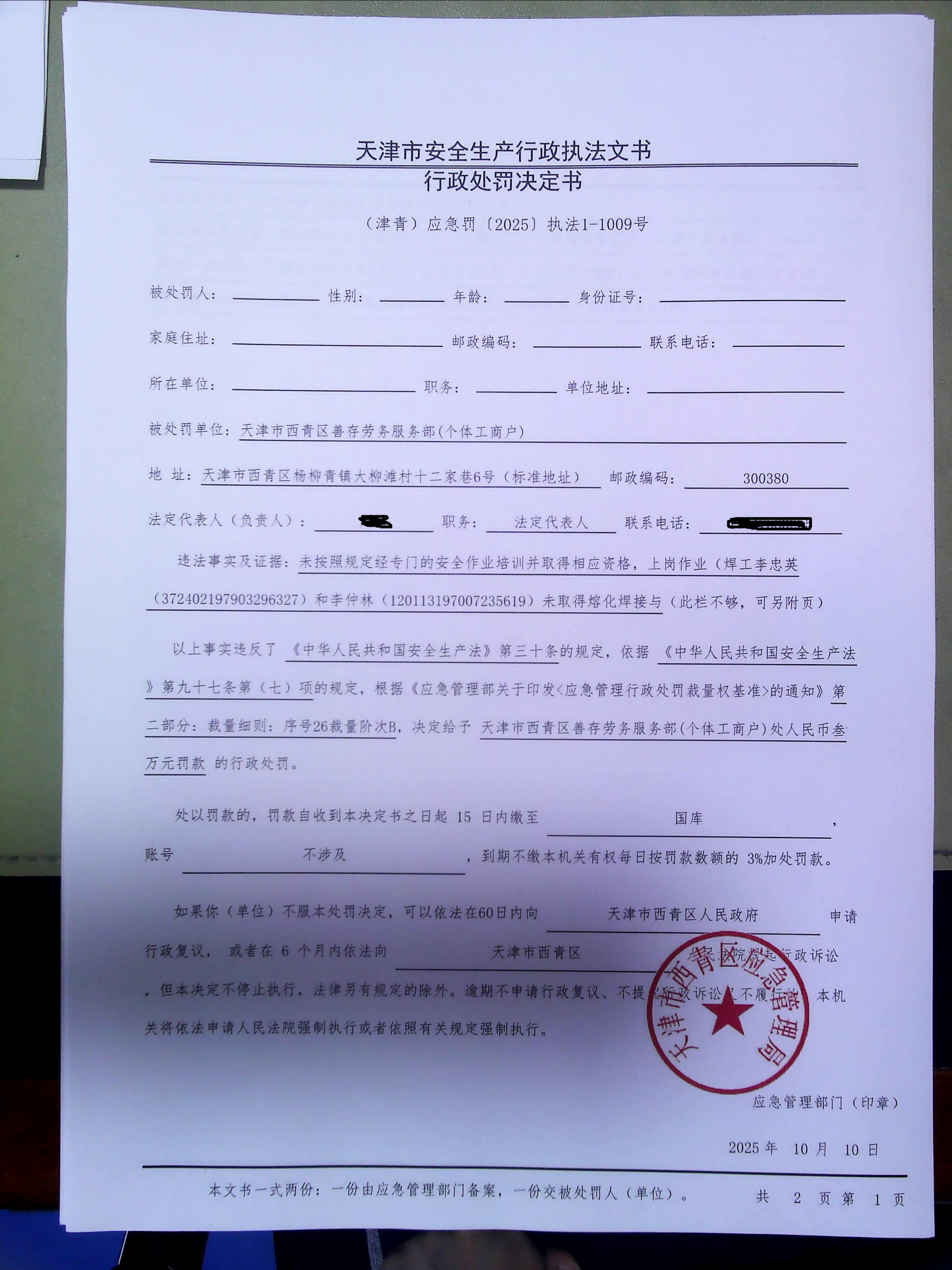 天津市西青区应急管理局 2025.10.10 (津青)应急罚﹝2025﹞执法1-1009号