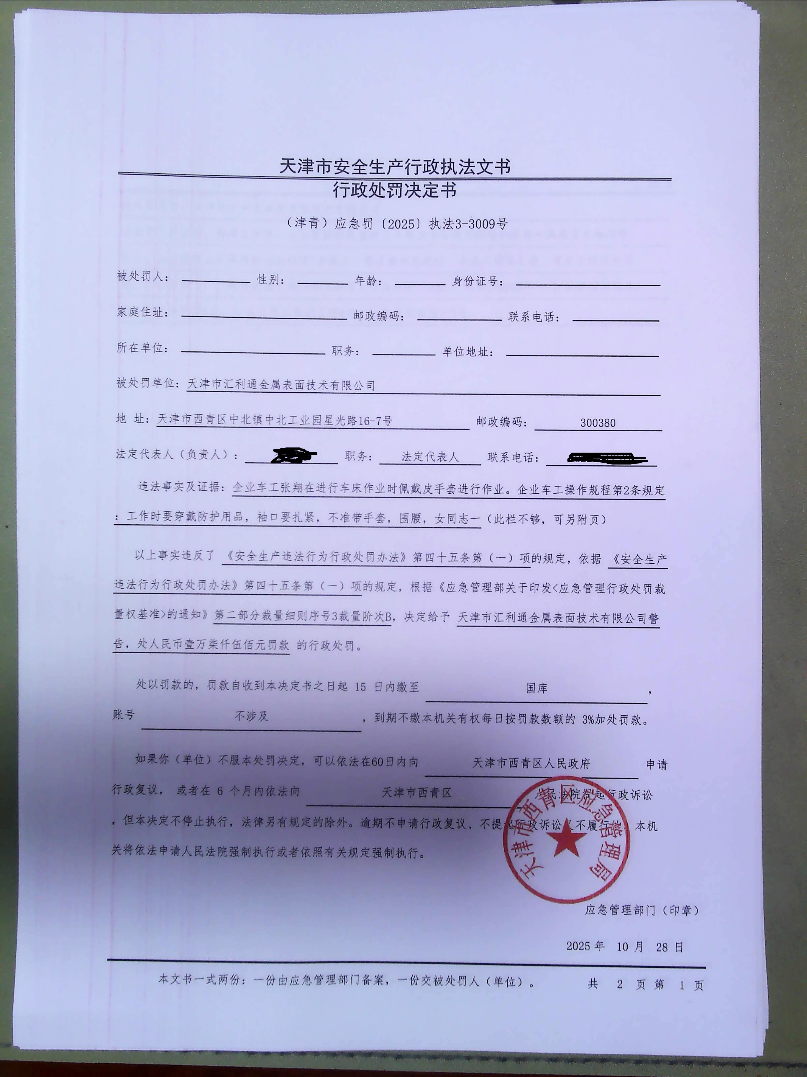 1 天津市汇利通金属表面技术有限公司 天津市汇利通金属表面技术有限公司从业人员违反安全操作规程进行作业案 天津市西青区应急管理局 2025.10.28 (津青)应急罚﹝2025﹞执法3-3009号