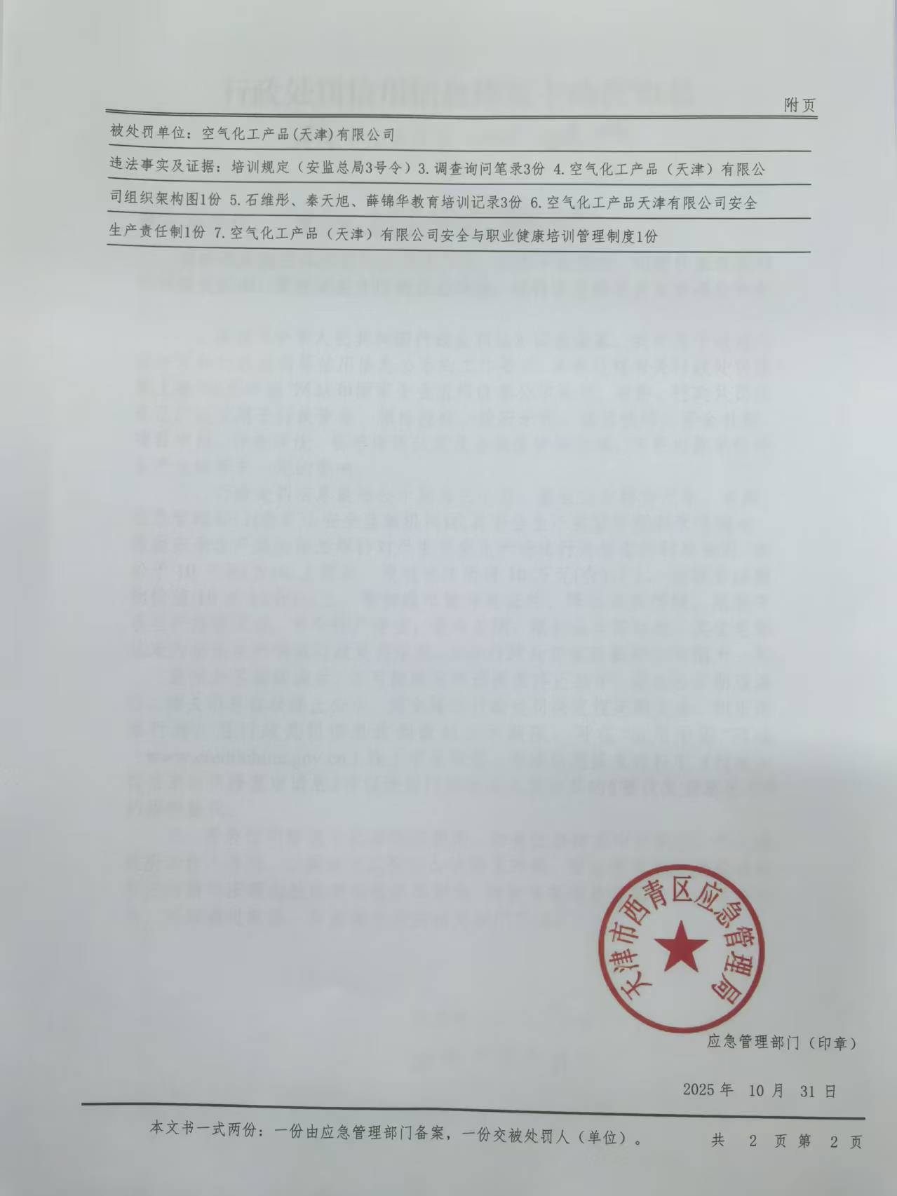 1 空气化工产品(天津)有限公司 空气化工产品(天津)有限公司未按照规定对销售部员工石维彤、秦天旭进行入职三级安全教育案 天津市西青区应急管理局 2025.10.31 (津青)应急罚﹝2025﹞安监-015号