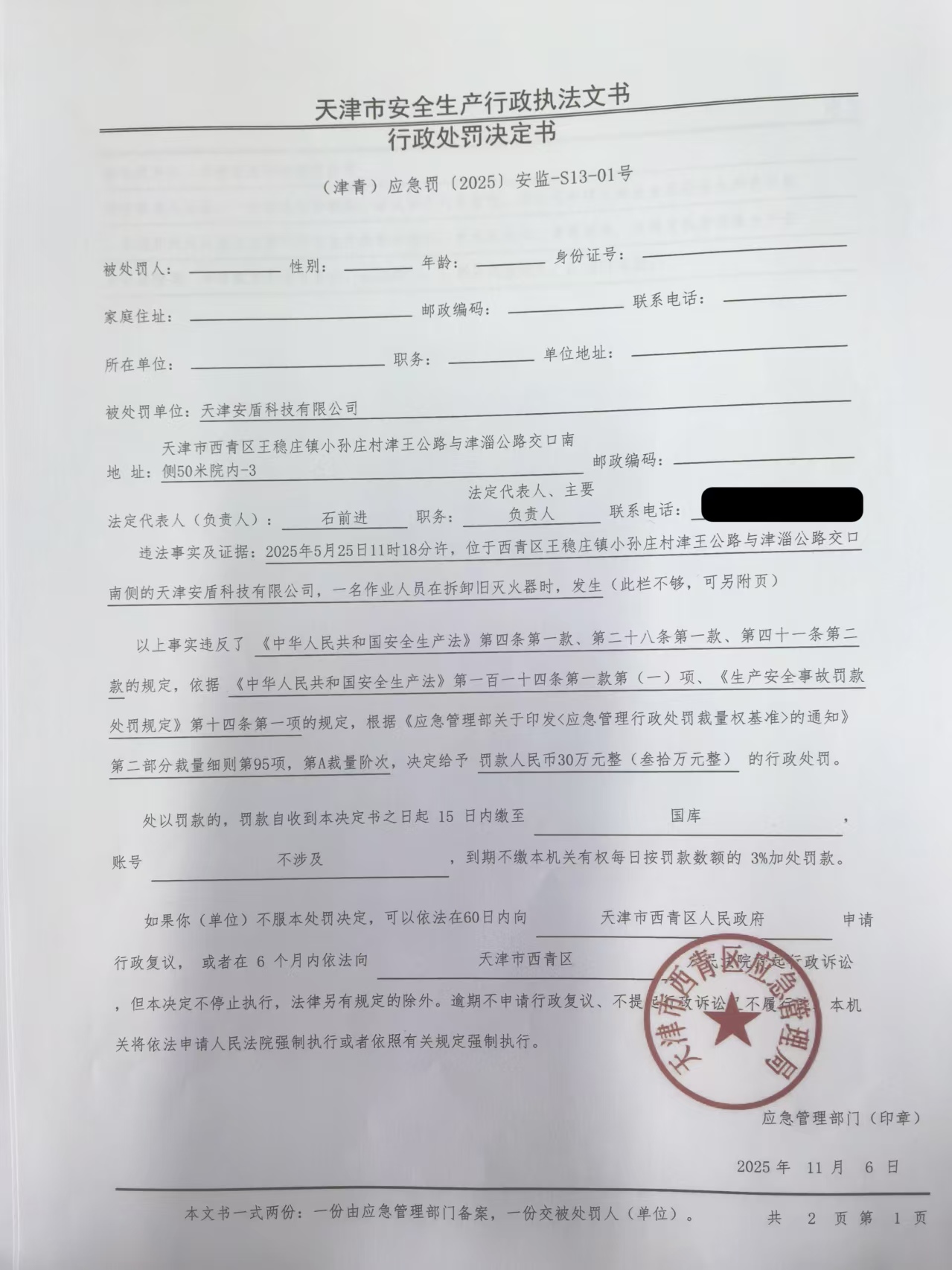 1 天津安盾科技有限公司 西青王稳庄天津安盾科技有限公司“5·25”一般物体打击事故案 天津市西青区应急管理局 2025.11.06 (津青)应急罚﹝2025﹞安监-S13-01号