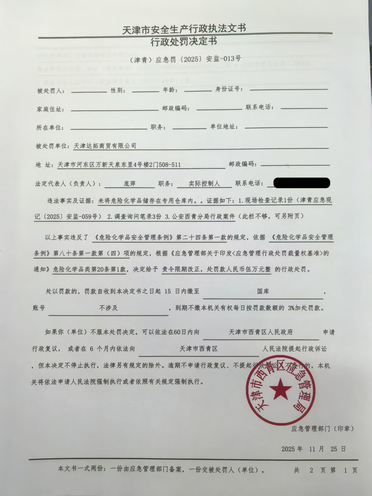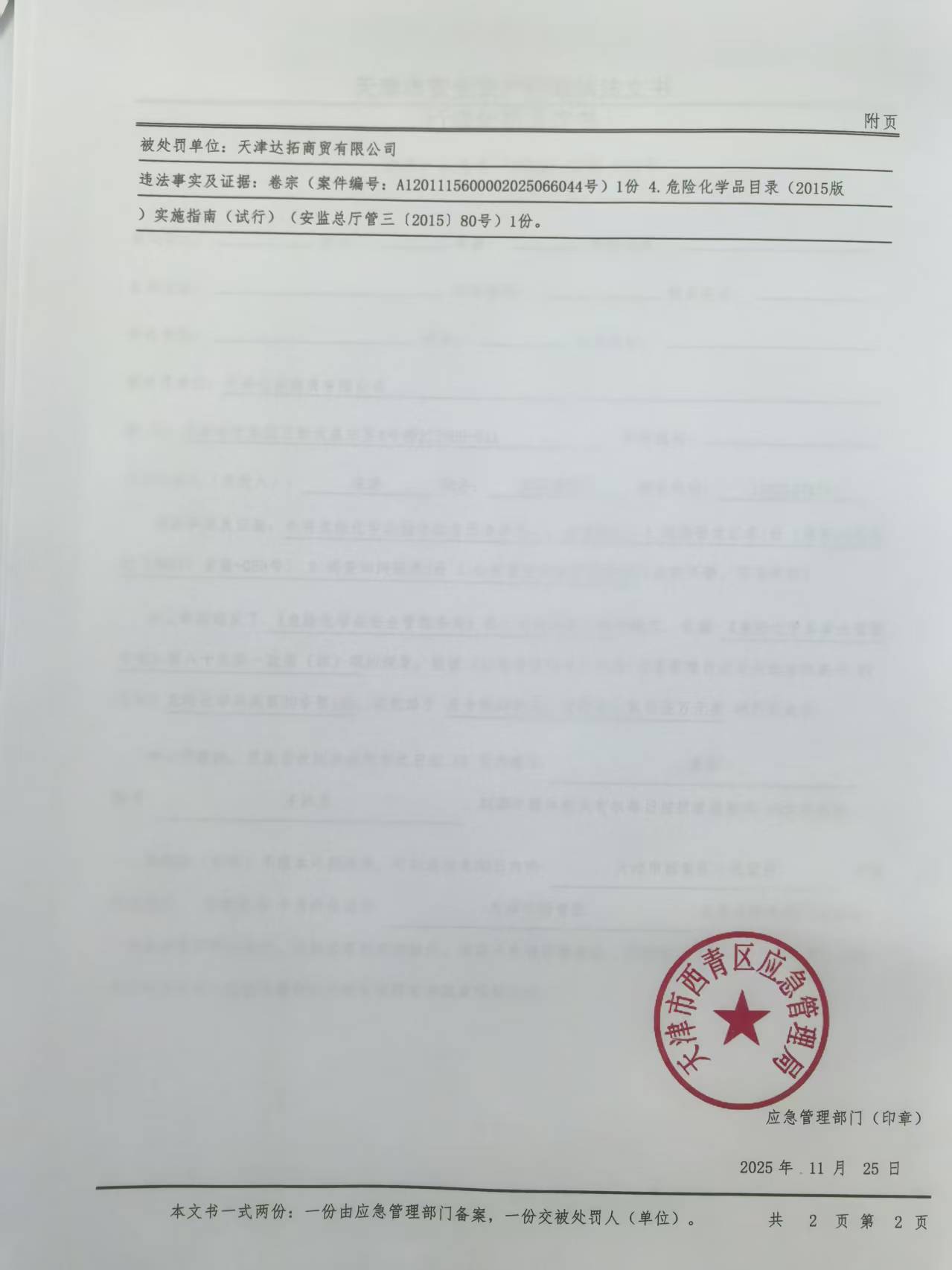 1 天津达拓商贸有限公司 天津达拓商贸有限公司未将汽车油漆稀释剂等危险化学品储存在专用仓库内案 天津市西青区应急管理局 2025.11.25 (津青)应急罚﹝2025﹞安监-013号