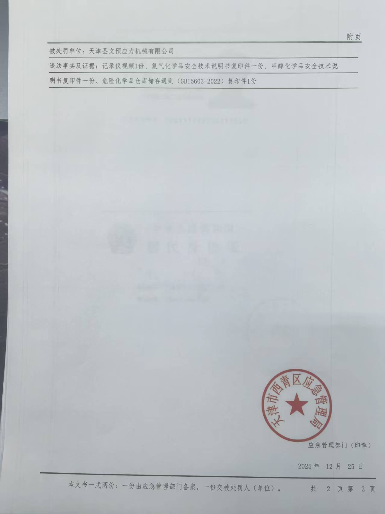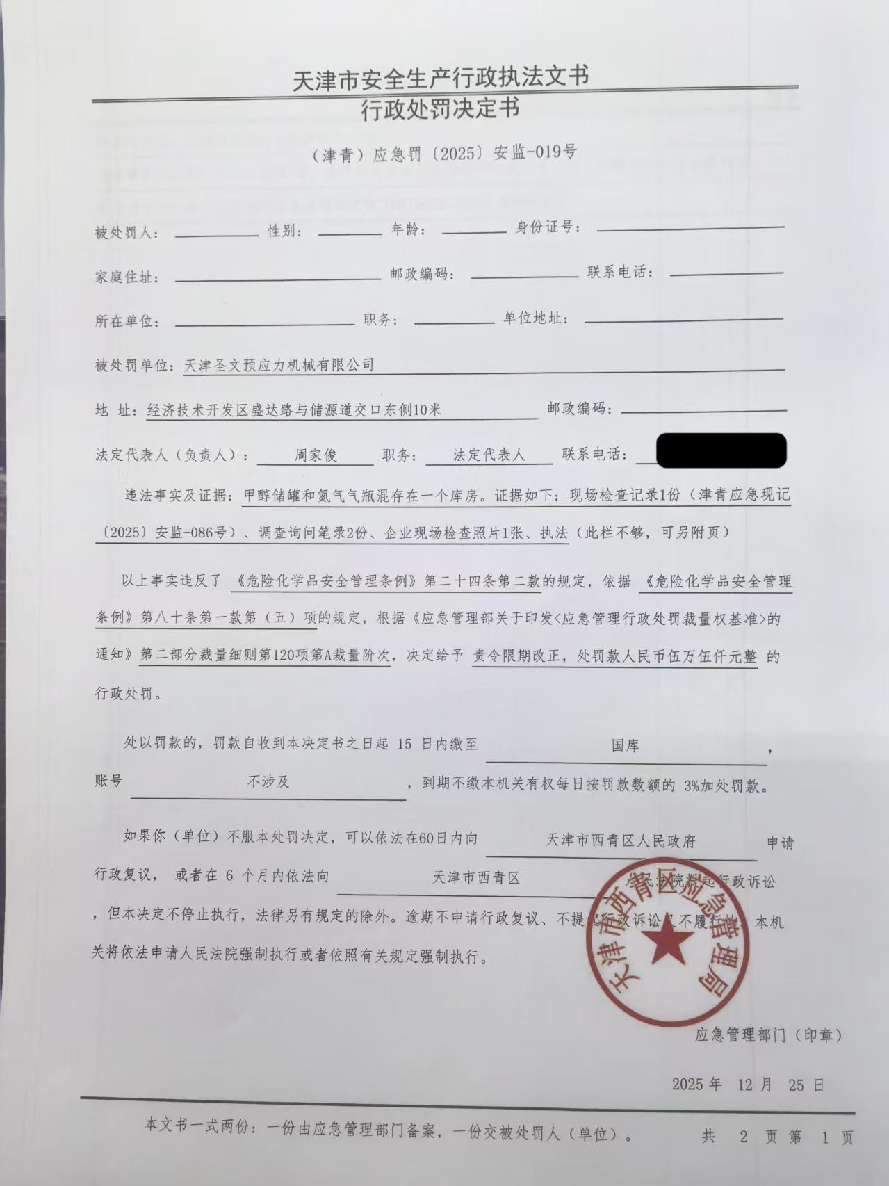 1 天津圣文预应力机械有限公司 天津圣文预应力机械有限公司库房甲醇储罐和氮气气瓶混存案 天津市西青区应急管理局 2025.12.25 (津青)应急罚﹝2025﹞安监-019号