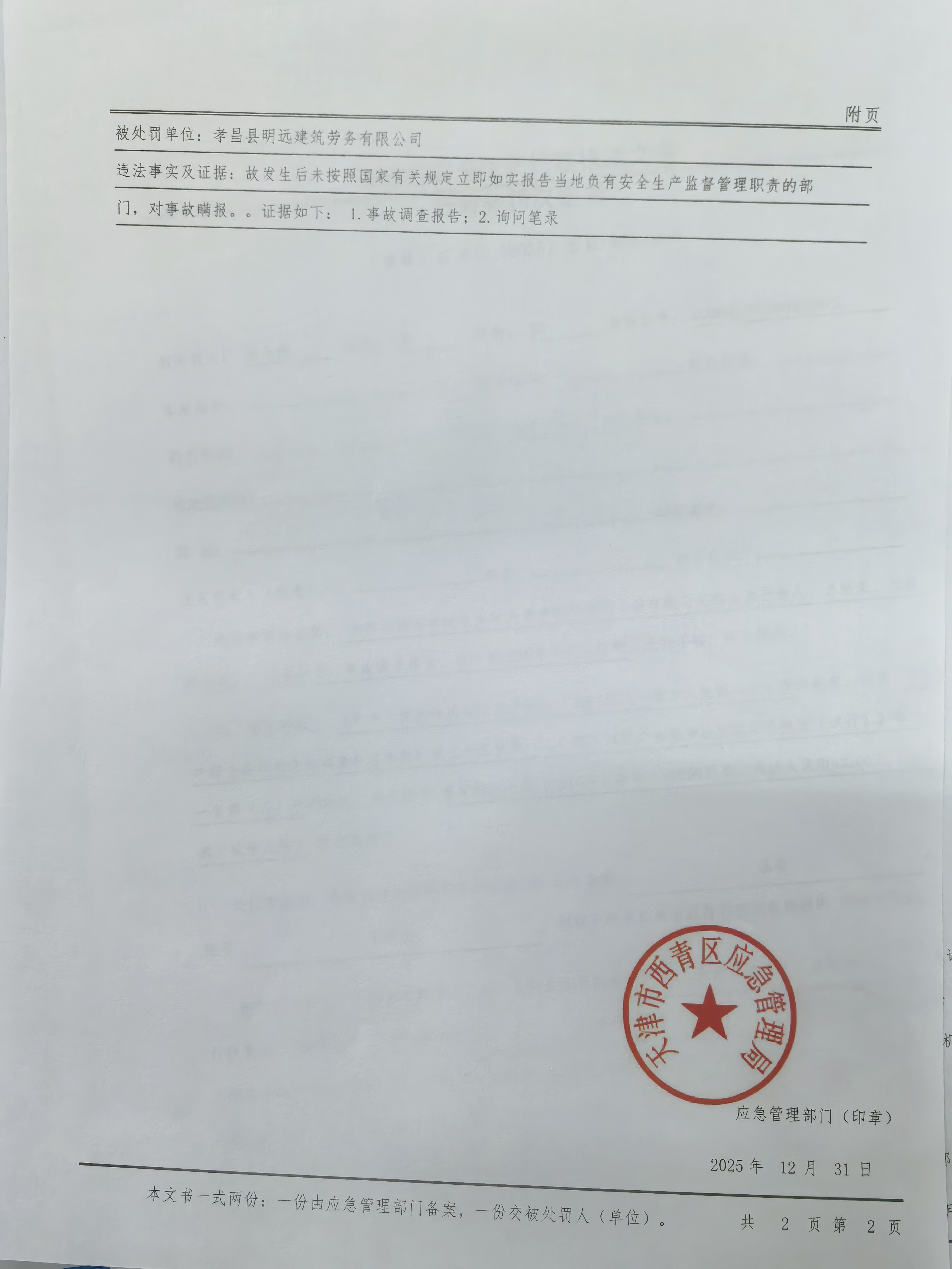 1 孝昌县明远建筑劳务有限公司 2017年辛口示范小城镇五期还迁楼建设项目“4·24”一般高处坠落事故案 天津市西青区应急管理局 2025.12.31 (津青)应急罚﹝2025﹞安监-S16-01号