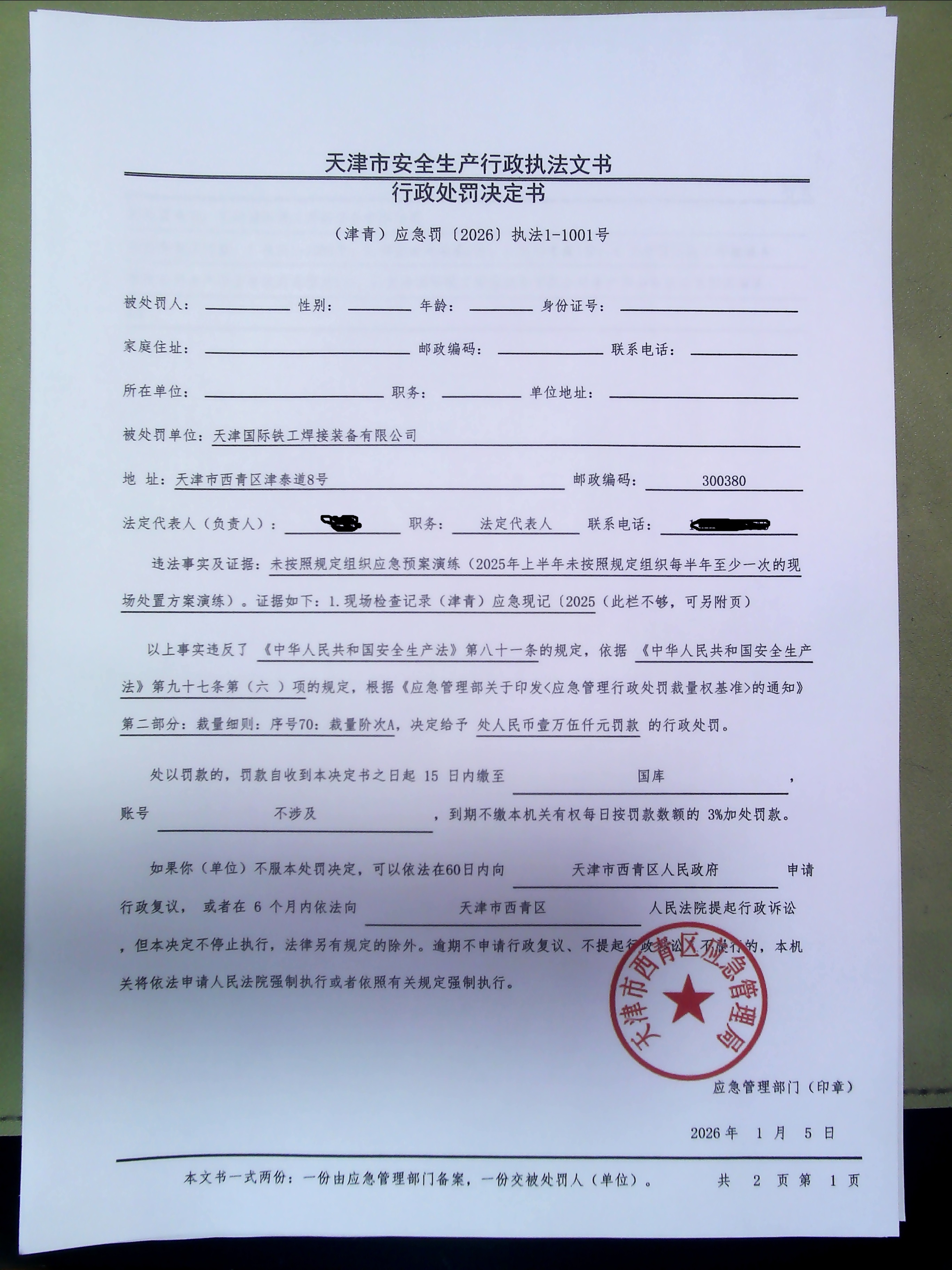 1 天津国际铁工焊接装备有限公司 天津国际铁工焊接装备有限公司未按照规定组织应急预案演练案 天津市西青区应急管理局 2026.01.05 (津青)应急罚﹝2026﹞执法1-1001号