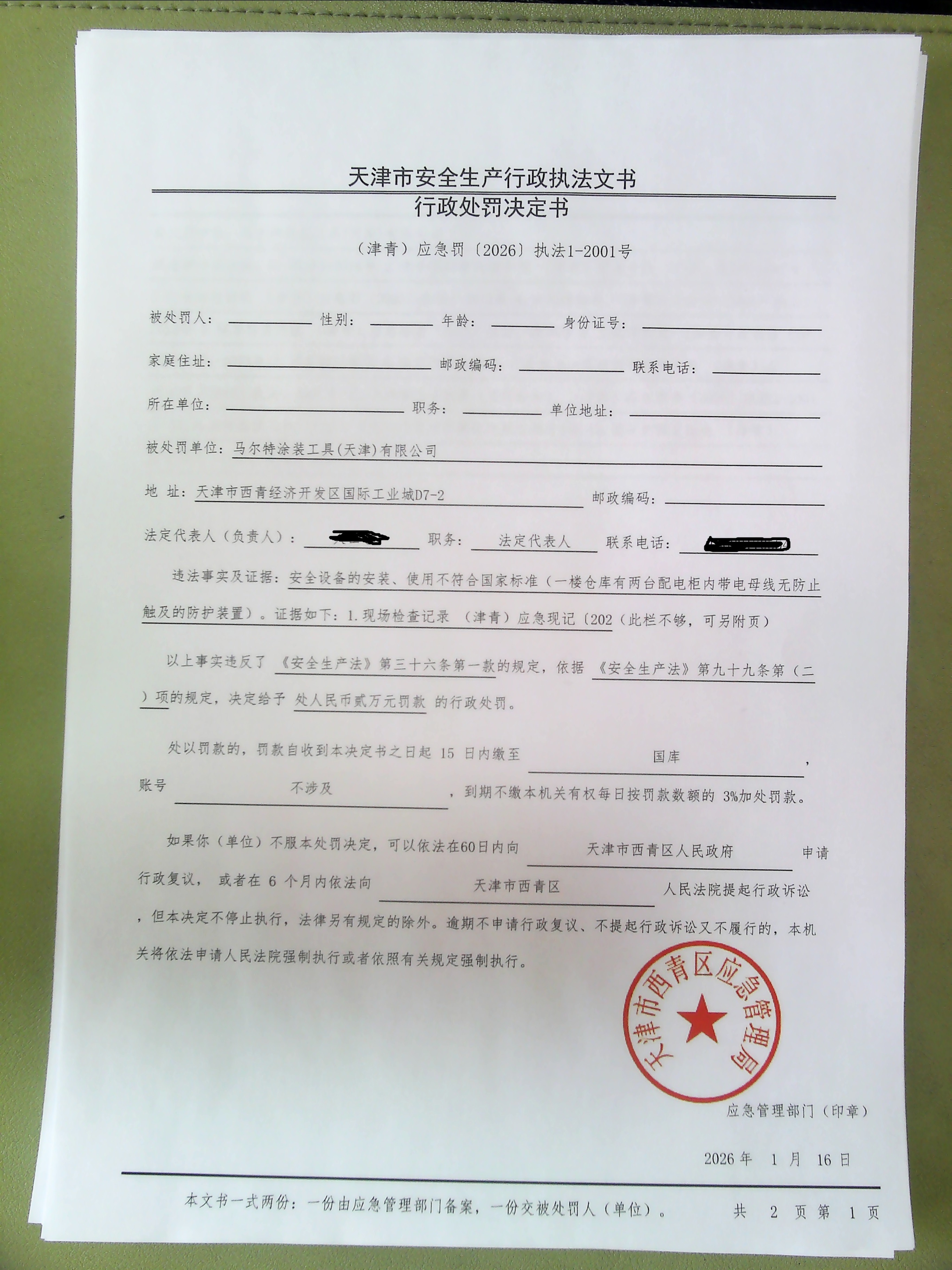 1 马尔特涂装工具(天津)有限公司 马尔特涂装工具(天津)有限公司安全设备的安装、使用不符合国家标准案 天津市西青区应急管理局 2026.1.16 (津青)应急罚﹝2026﹞执法1-2001号