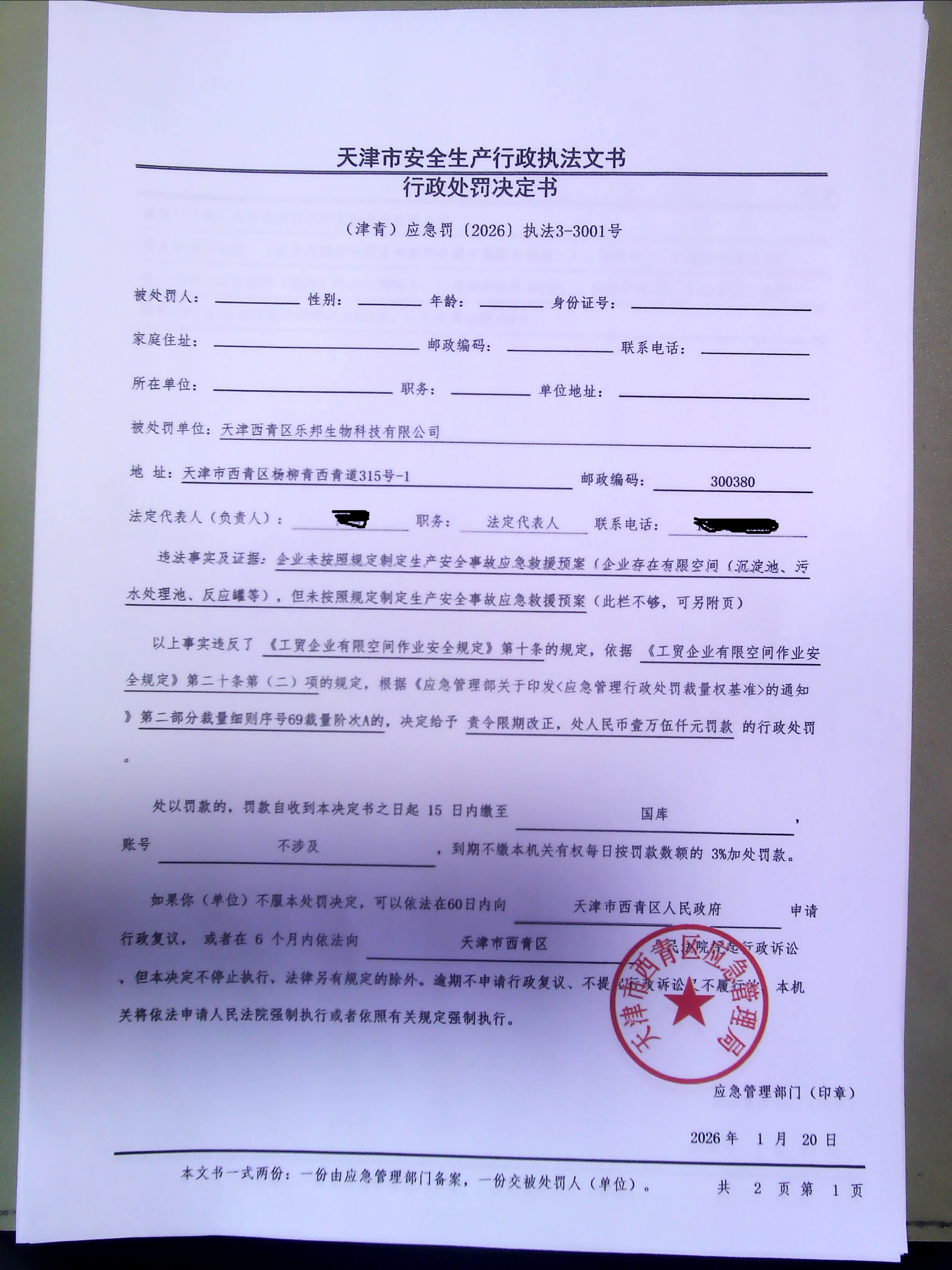 1 天津西青区乐邦生物科技有限公司 天津西青区乐邦生物科技有限公司未按照规定制定生产安全事故应急救援预案案 天津市西青区应急管理局 2026.1.20 (津青)应急罚﹝2026﹞执法3-3001号