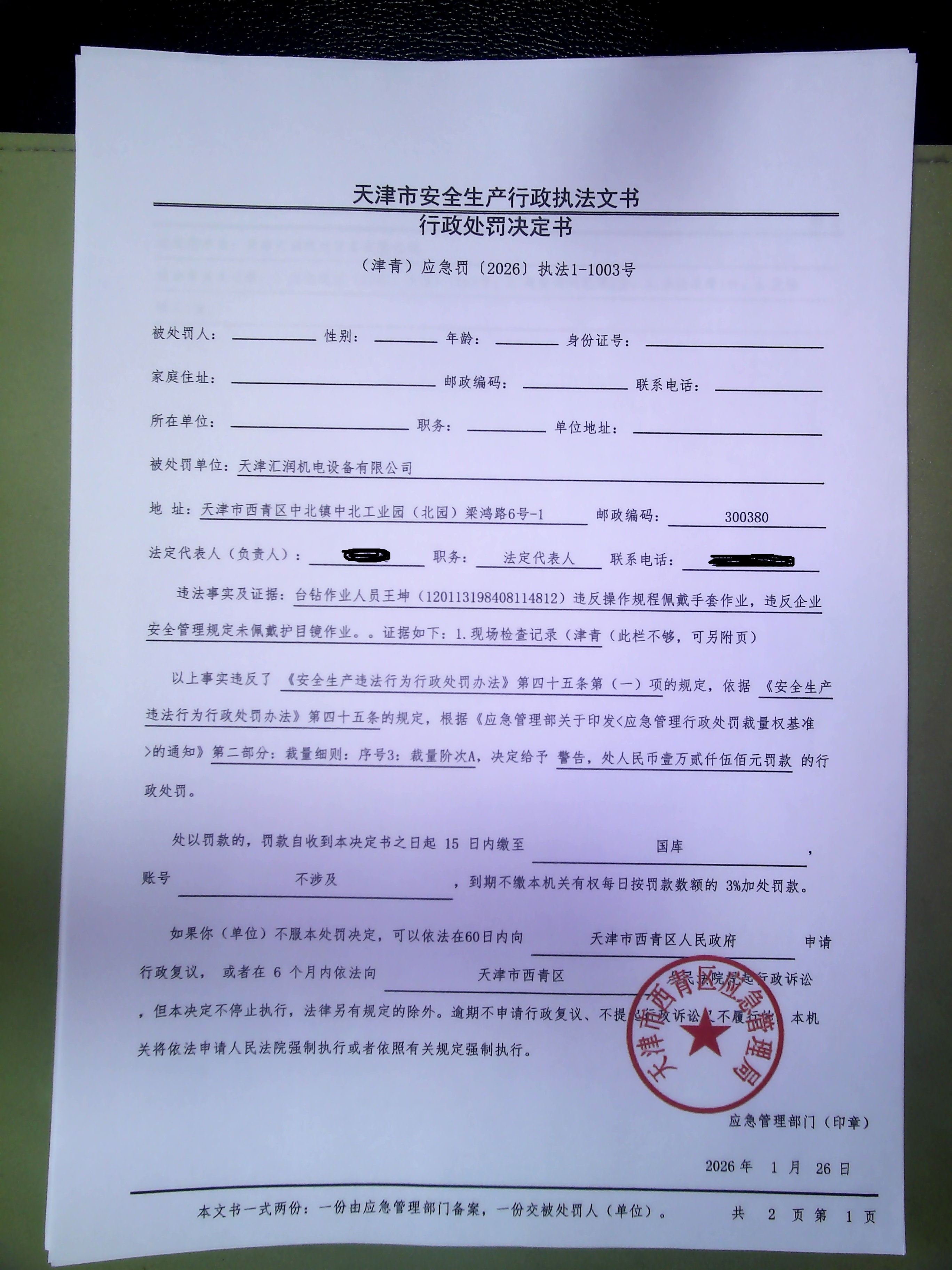 1 天津汇润机电设备有限公司 天津汇润机电设备有限公司违反操作规程和安全管理规定作业案 天津市西青区应急管理局 2026.1.26 (津青)应急罚﹝2026﹞执法1-1003号