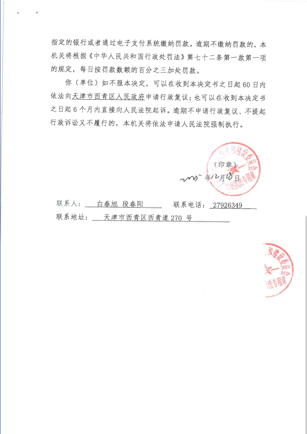 依据《西青区关于全面推行行政执法公示制度执法全过程记录制度重大执法决定法律审核制度的实施方案》,对行政执法决定予以公示。