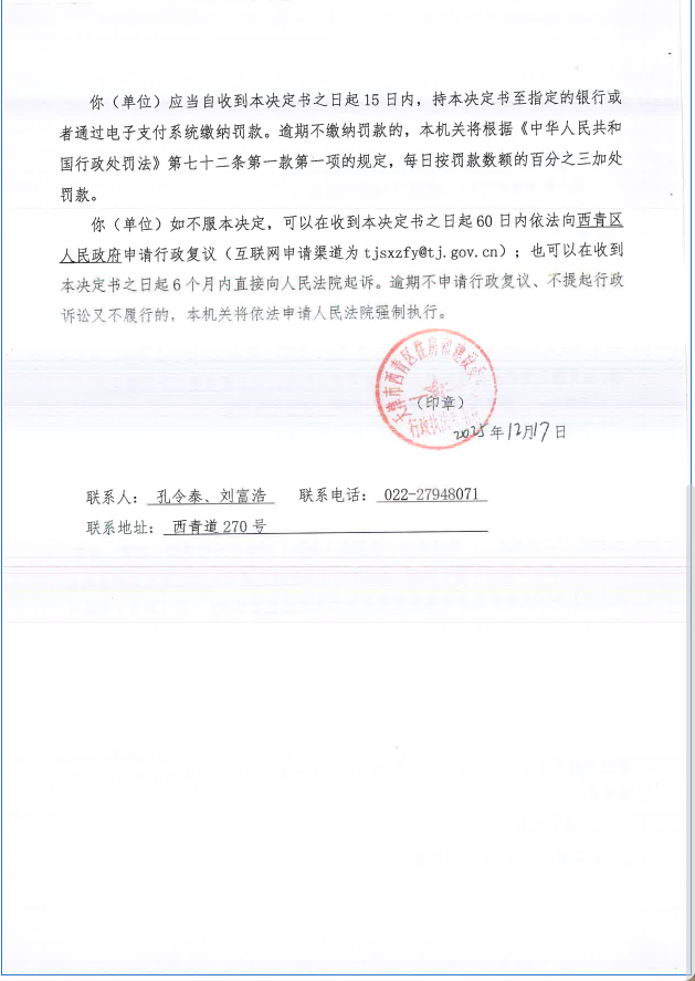 依据《西青区关于全面推行行政执法公示制度执法全过程记录制度重大执法决定法律审核制度的实施方案》,对行政执法决定予以公示。