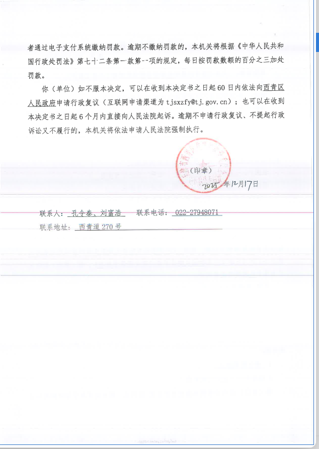 依据《西青区关于全面推行行政执法公示制度执法全过程记录制度重大执法决定法律审核制度的实施方案》,对行政执法决定予以公示。