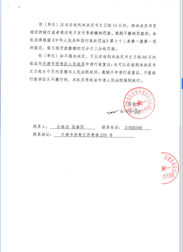 依据《西青区关于全面推行行政执法公示制度执法全过程记录制度重大执法决定法律审核制度的实施方案》,对行政执法决定予以公示。